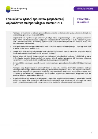 Komunikat o sytuacji społeczno-gospodarczej województwa małopolskiego w marcu 2020 r.