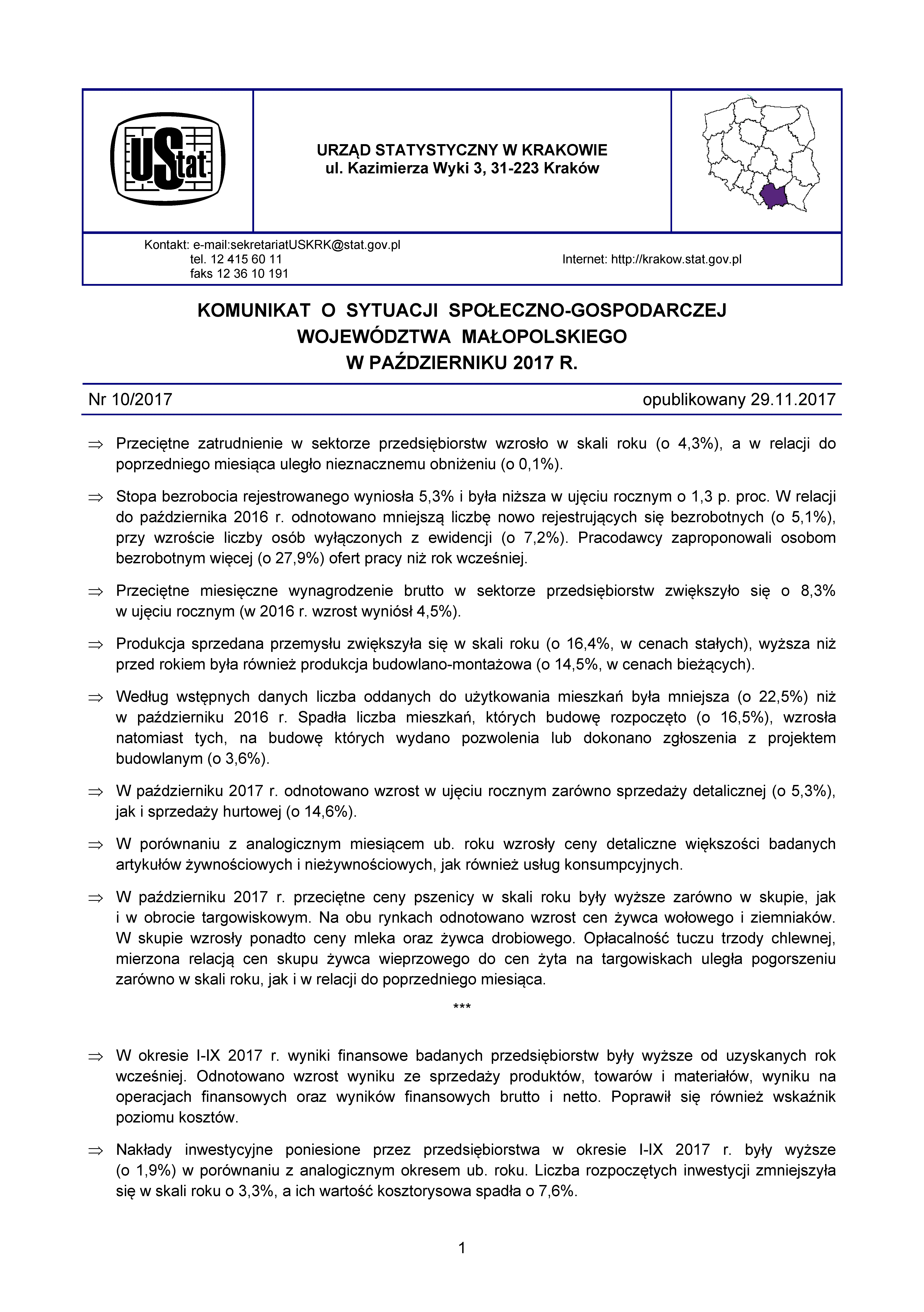 Komunikat o sytuacji społeczno-gospodarczej województwa małopolskiego w październiku 2017 r.