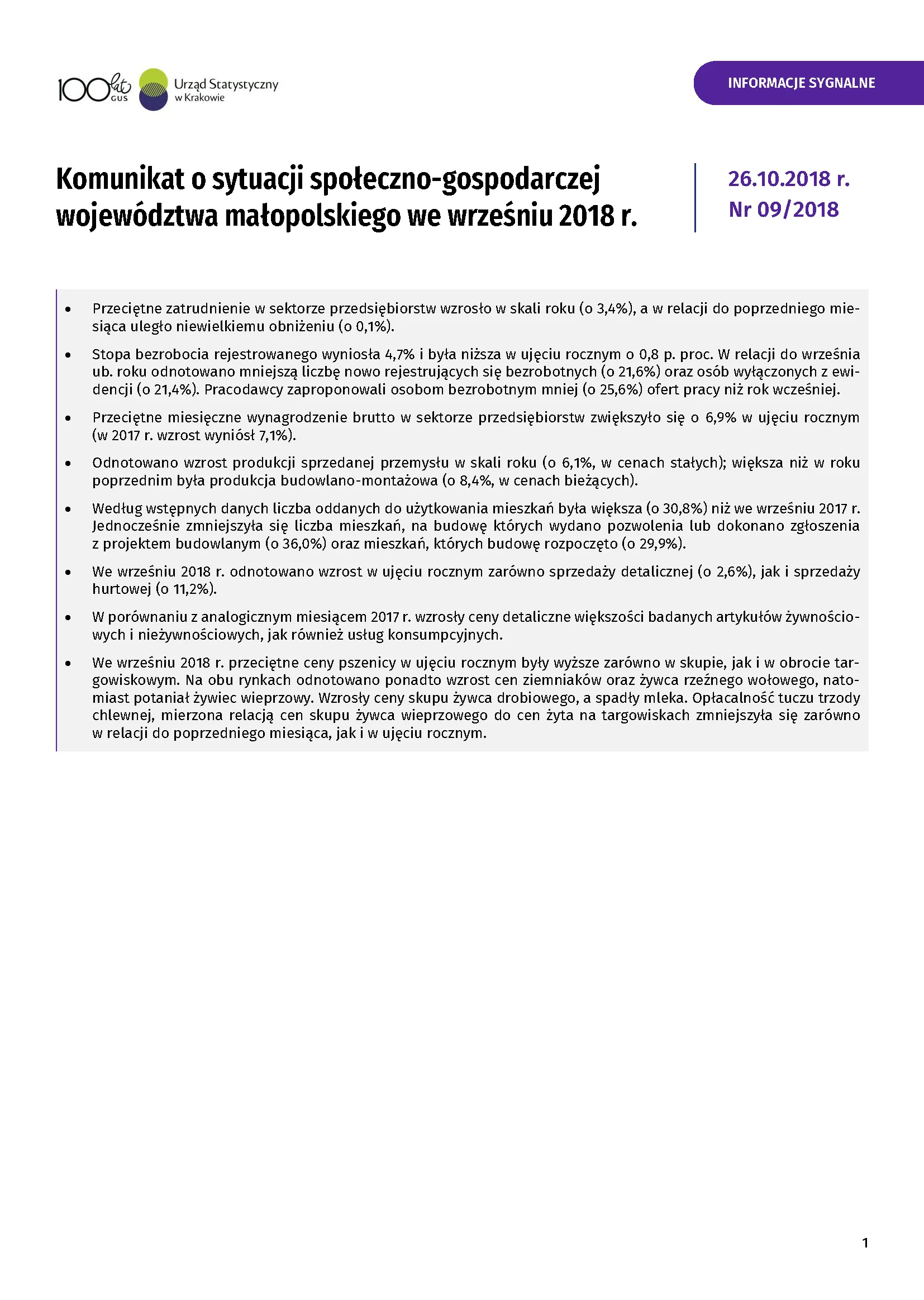 - Komunikat o sytuacji społeczno-gospodarczej województwa małopolskiego w październiku 2018 r.