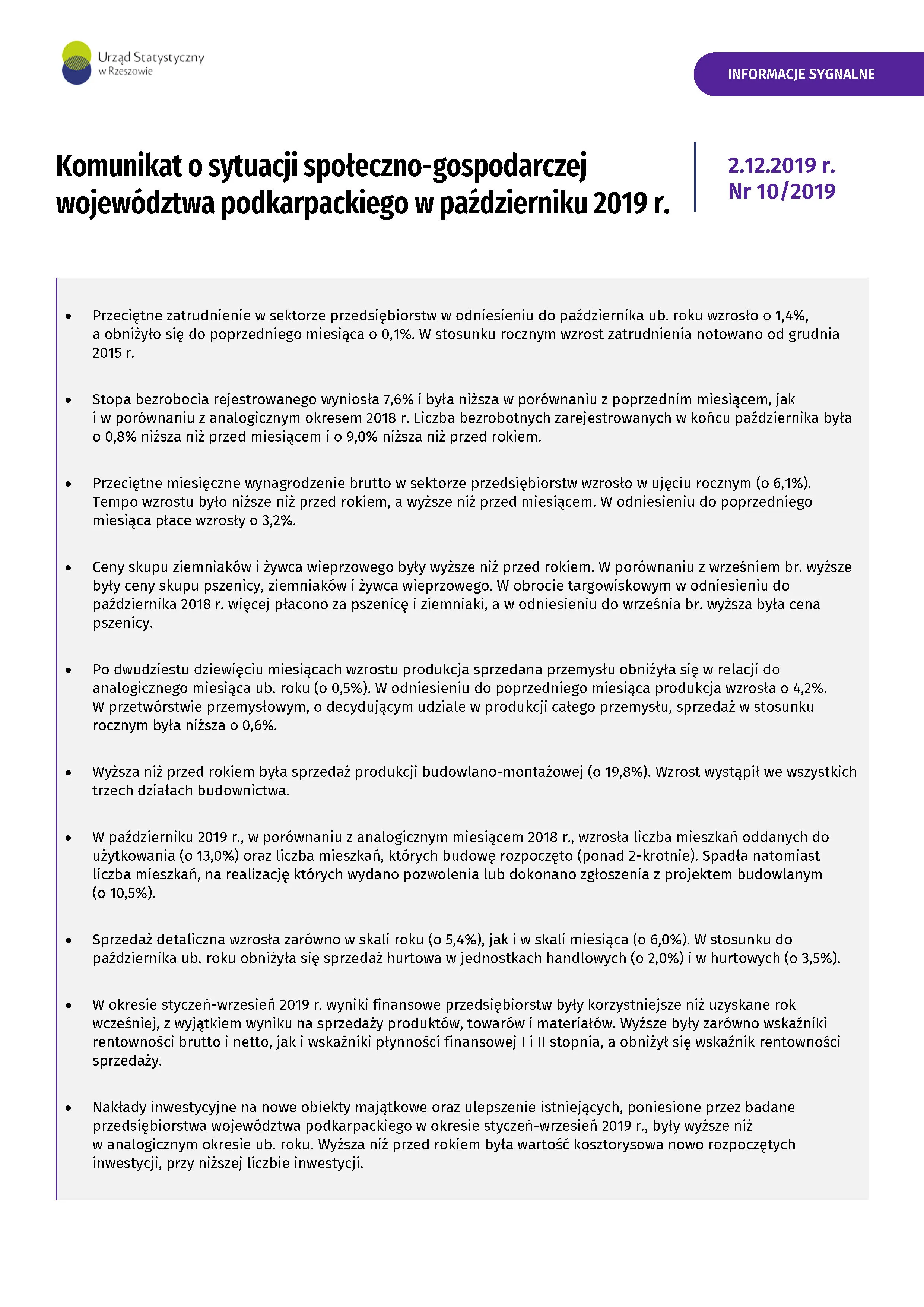 - Komunikat o sytuacji społeczno-gospodarczej województwa podkarpackiego listopad 2019 r.