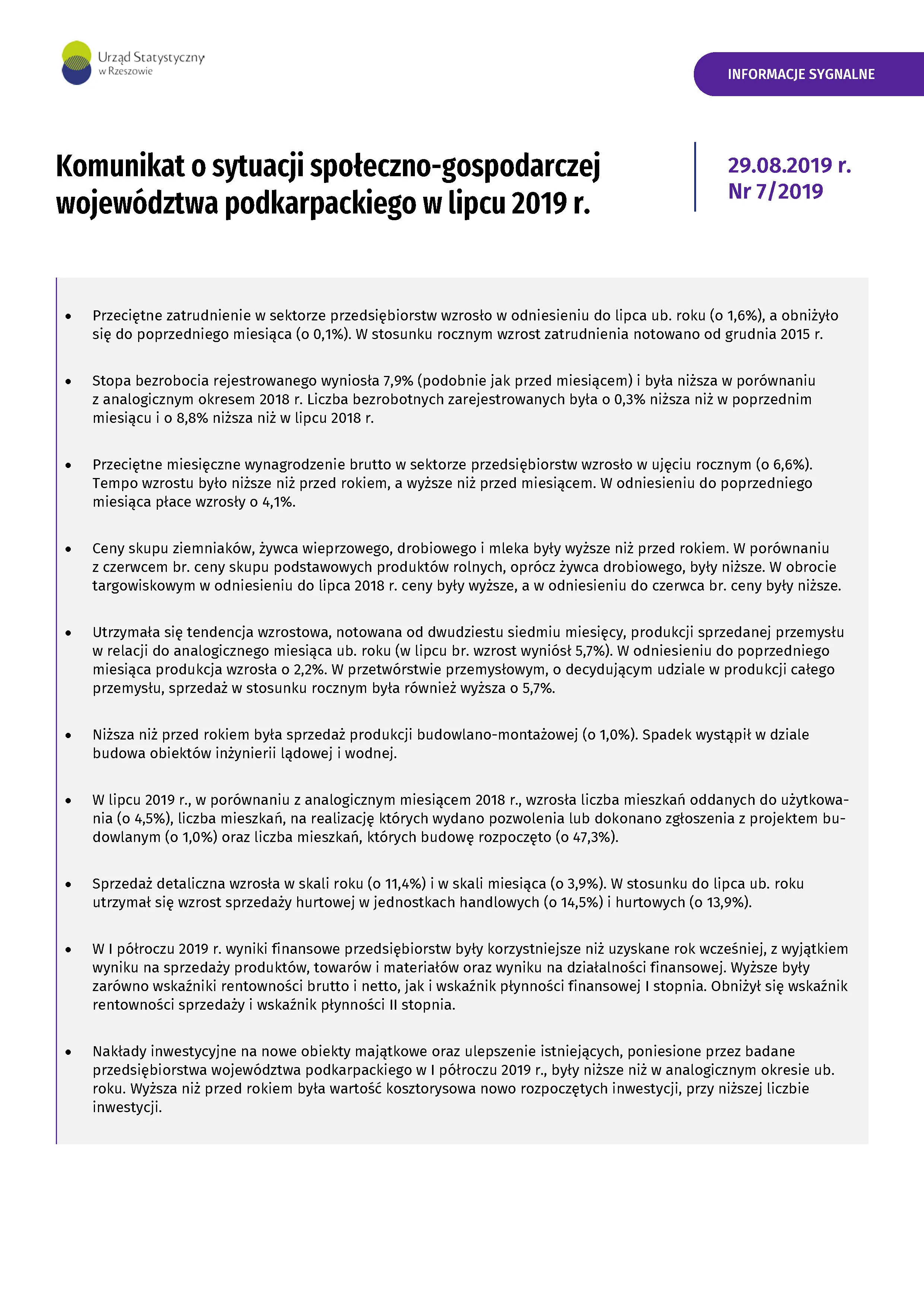 - Komunikat o sytuacji społeczno-gospodarczej województwa podkarpackiego sierpień 2019 r.