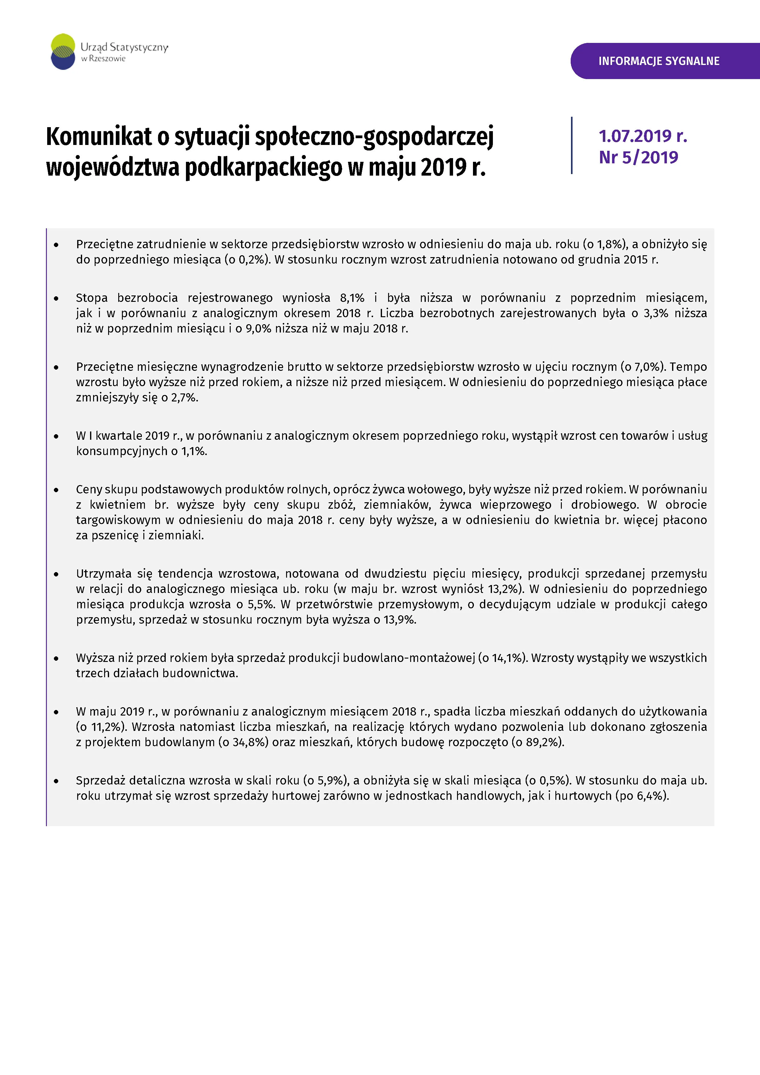 Komunikat o sytuacji społeczno-gospodarczej województwa podkarpackiego maj 2019 r.