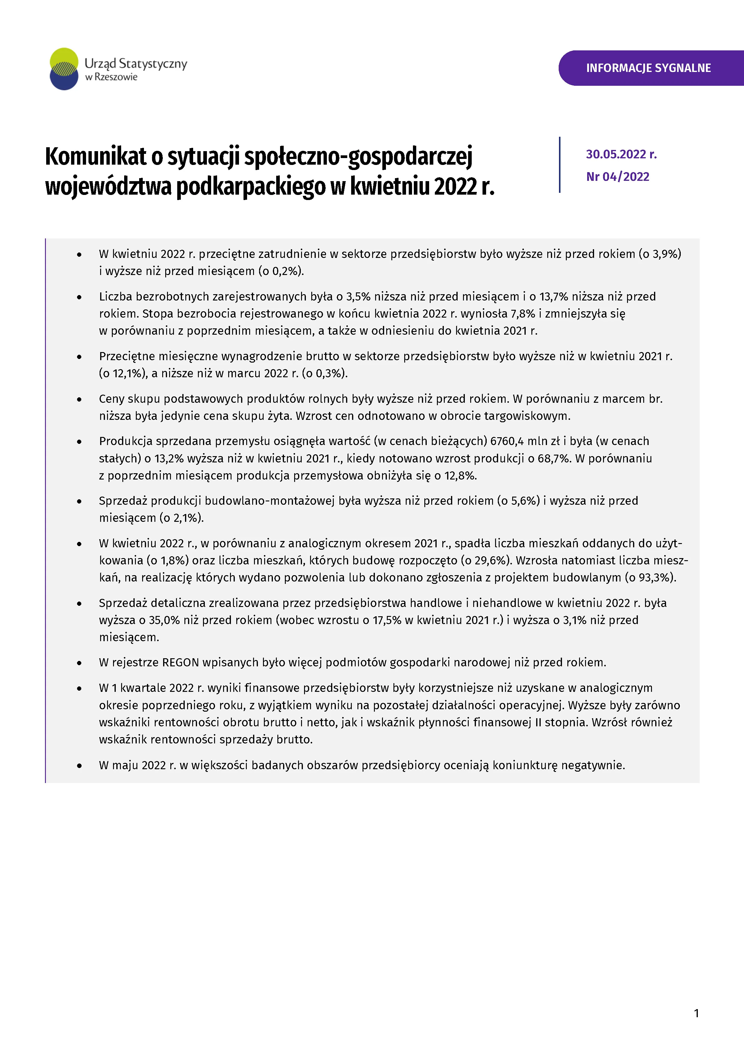 - Komunikat o sytuacji społeczno-gospodarczej województwa podkarpackiego w maju 2022 r.