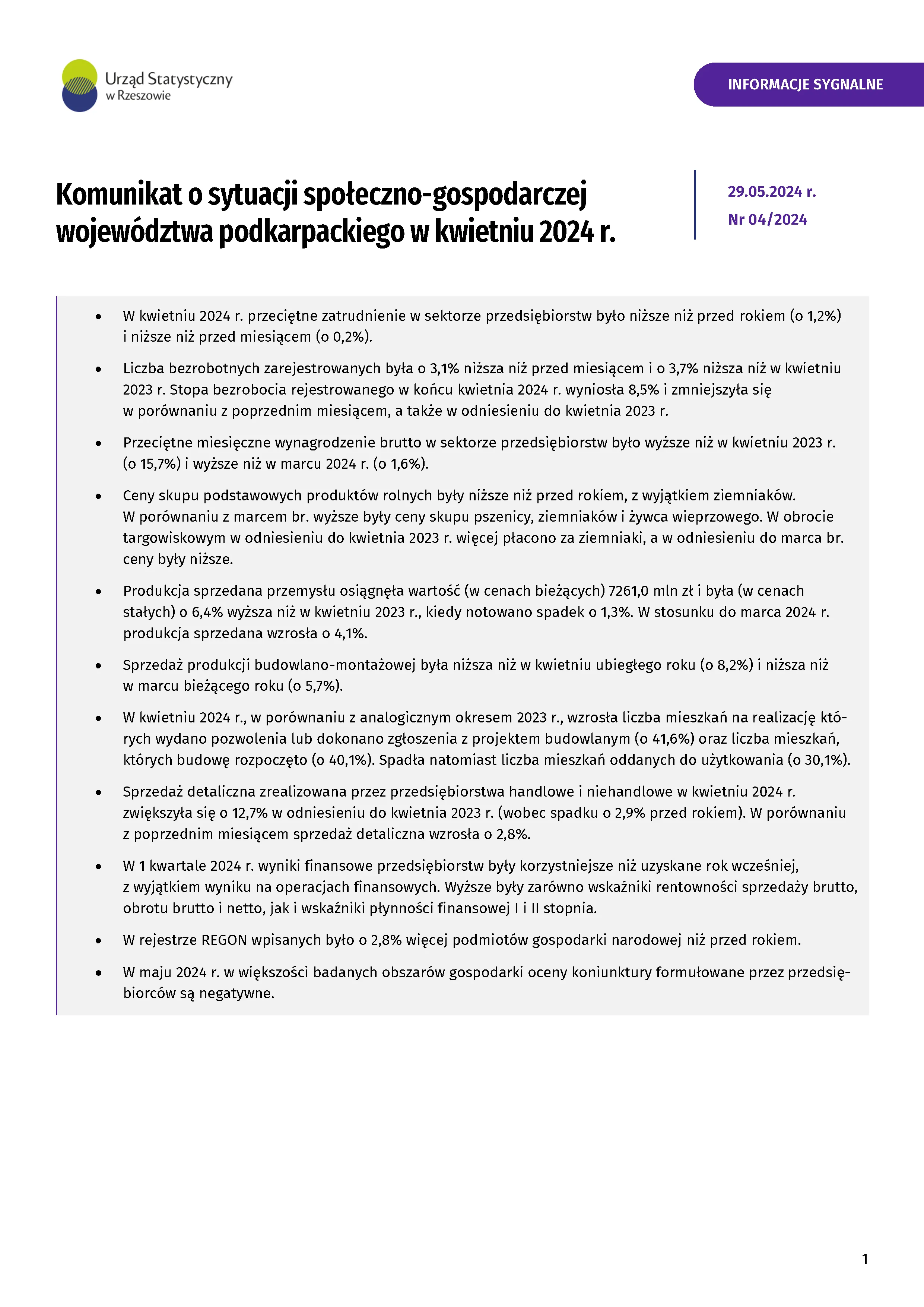 - Komunikat o sytuacji społeczno-gospodarczej województwa podkarpackiego w marcu 2024 r.