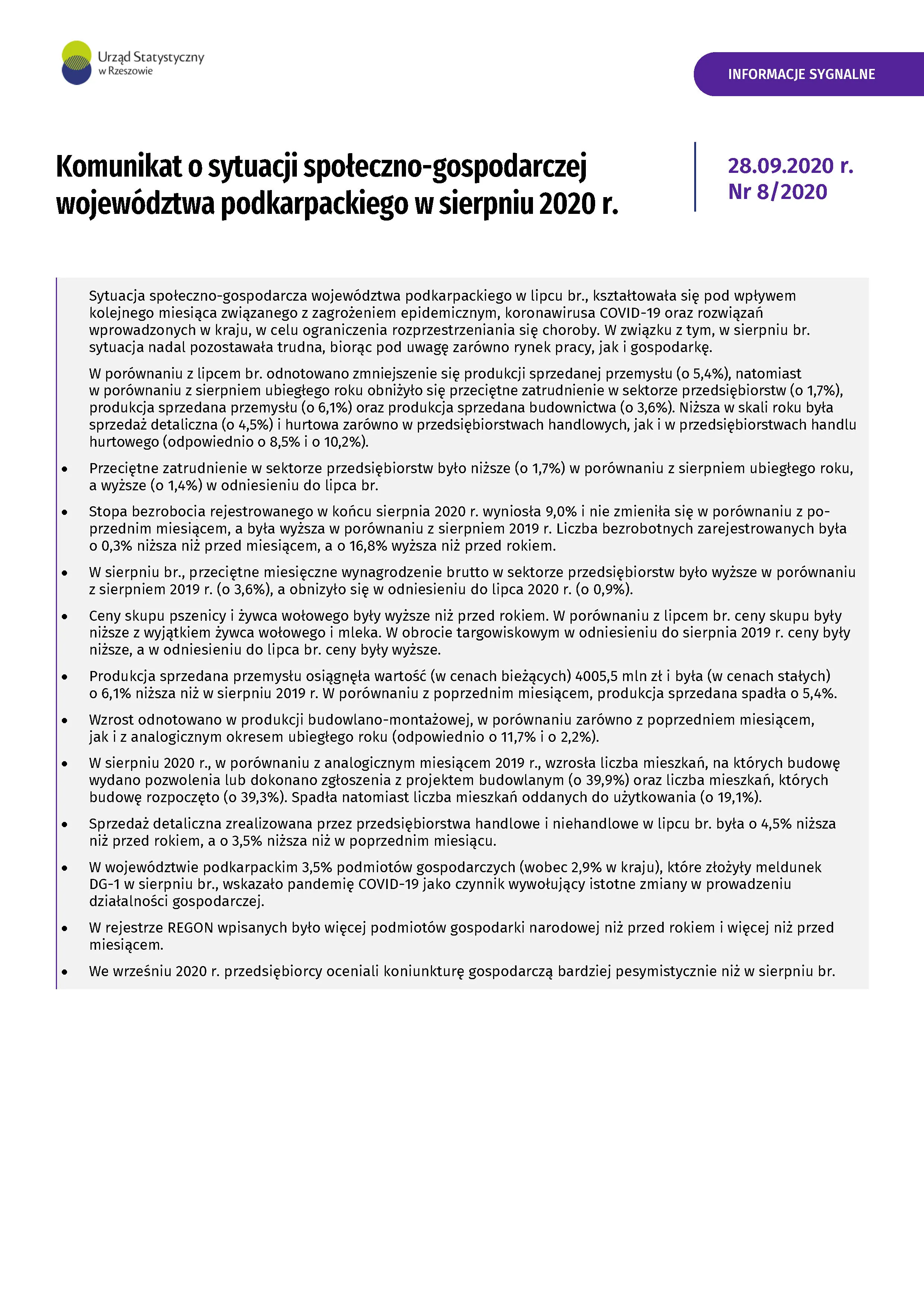 - Komunikat o sytuacji społeczno-gospodarczej województwa podkarpackiego we wrześniu 2020 r.