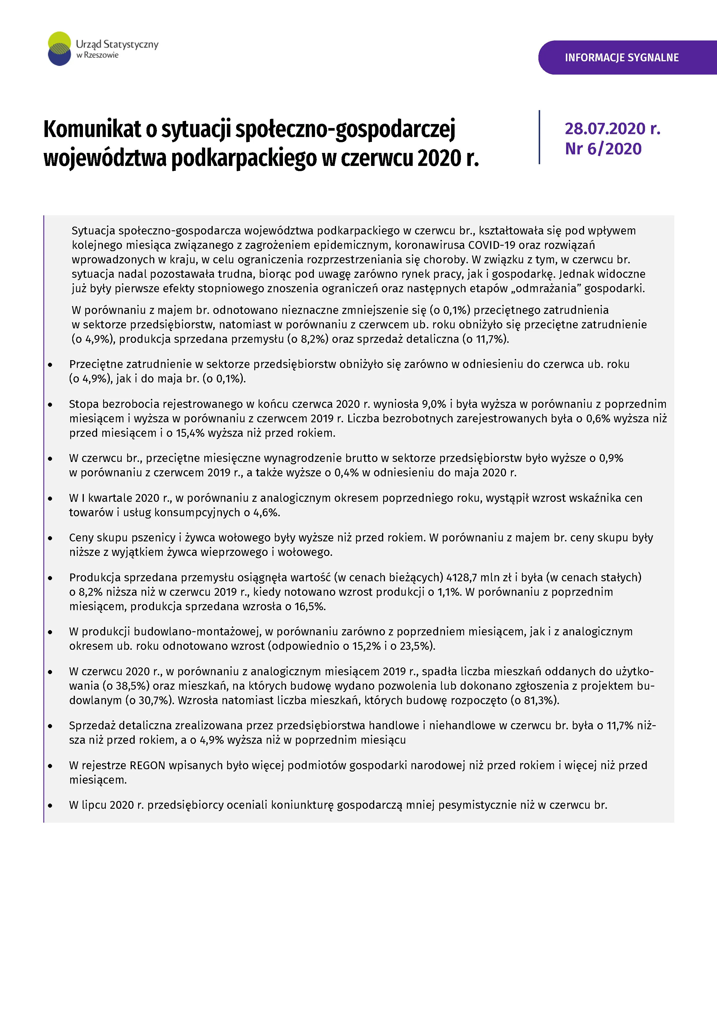- Komunikat o sytuacji społeczno-gospodarczej województwa podkarpackiego w lipcu 2020 r.