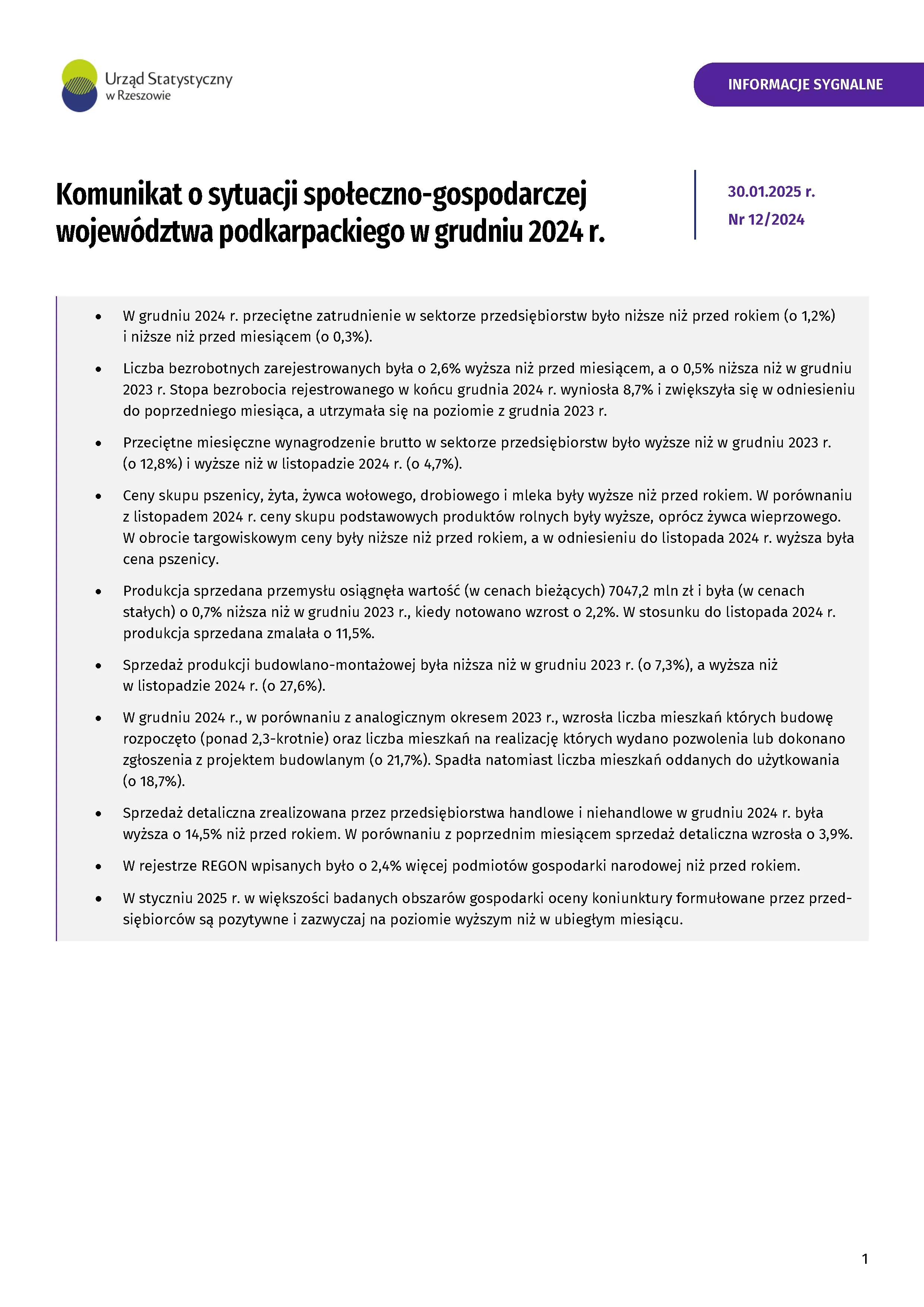 - Komunikat o sytuacji społeczno-gospodarczej województwa podkarpackiego w grudniu 2023 r.