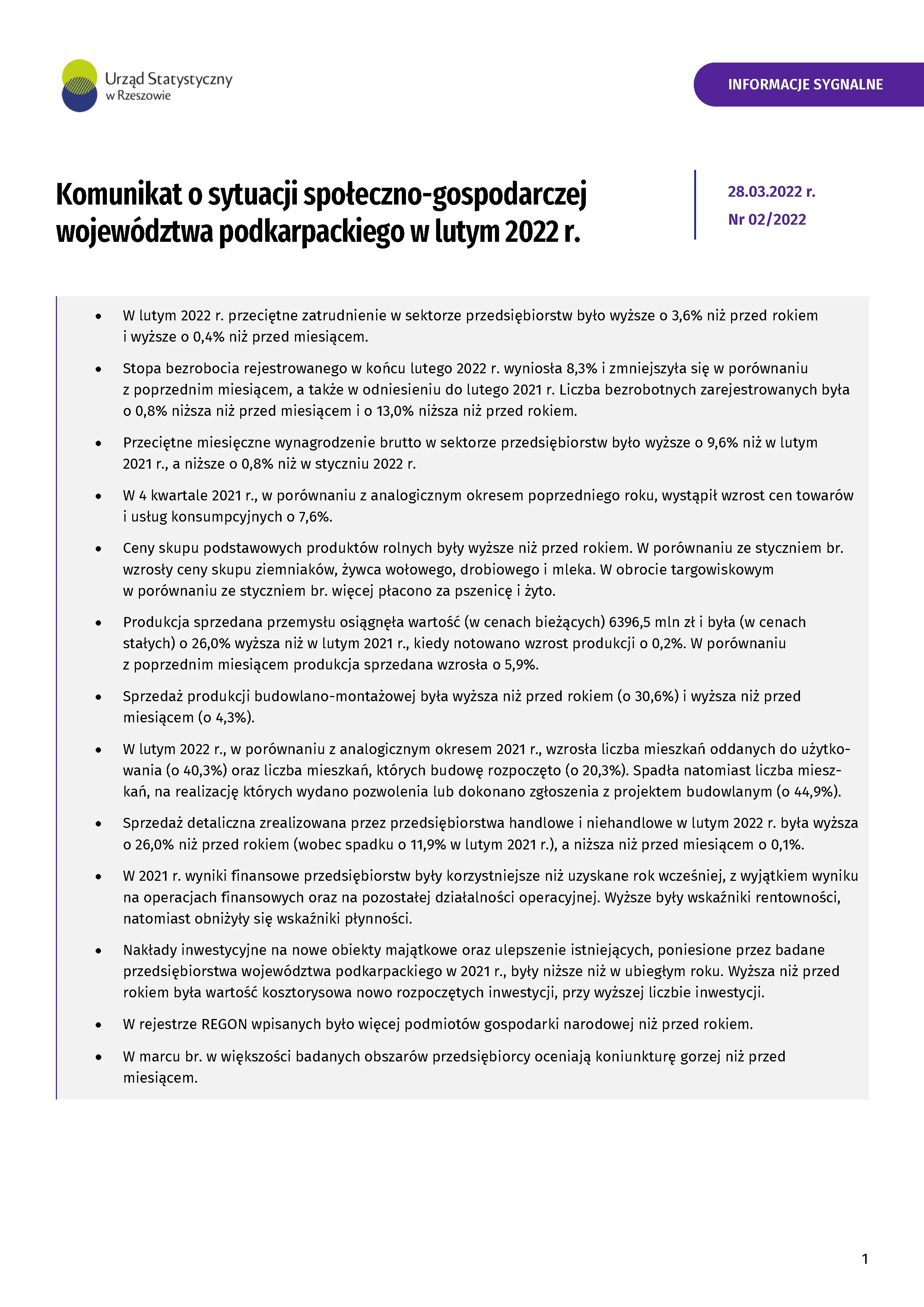 - Komunikat o sytuacji społeczno-gospodarczej województwa podkarpackiego w marcu 2022 r.