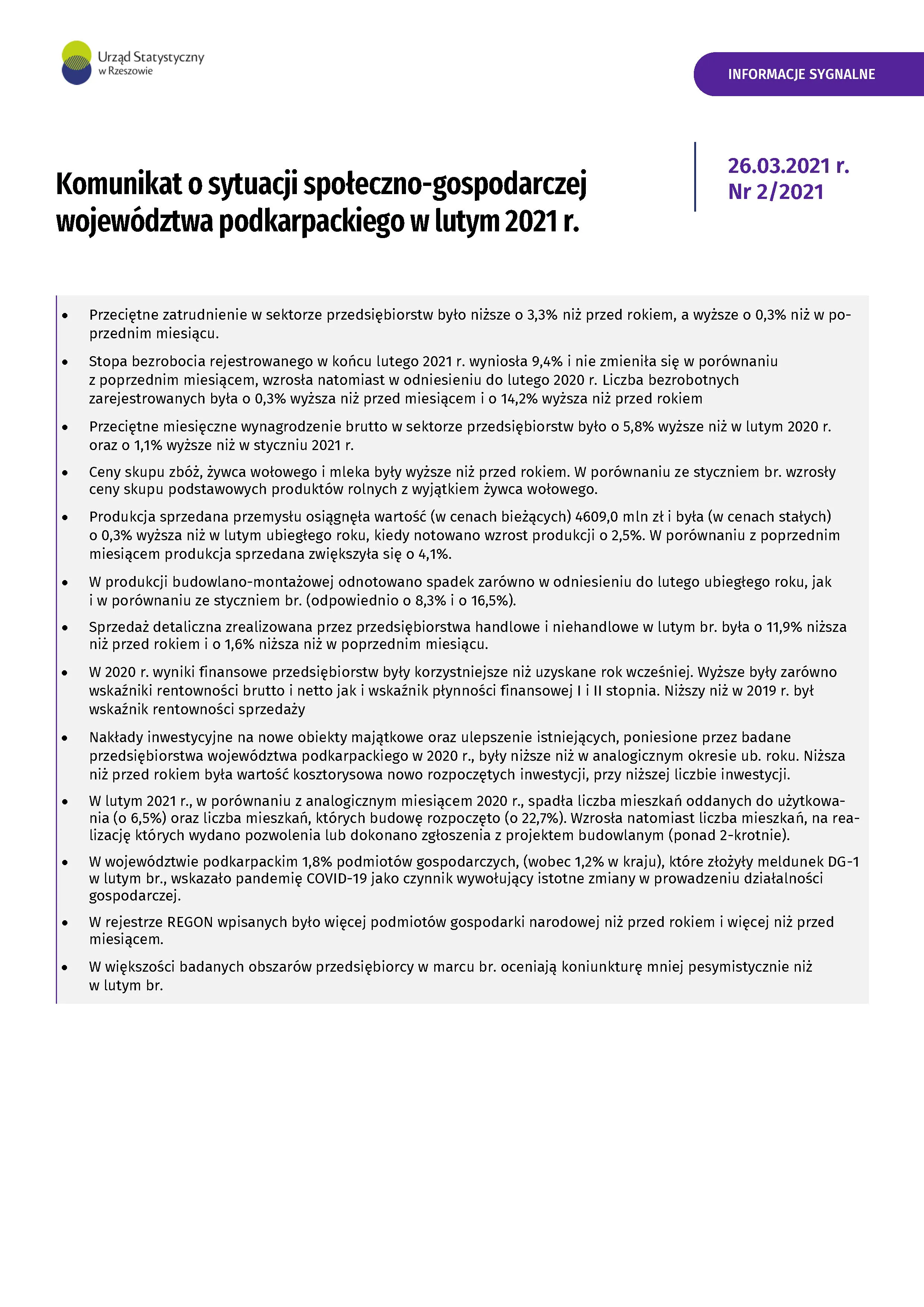 - Komunikat o sytuacji społeczno-gospodarczej województwa podkarpackiego w marcu 2021 r.