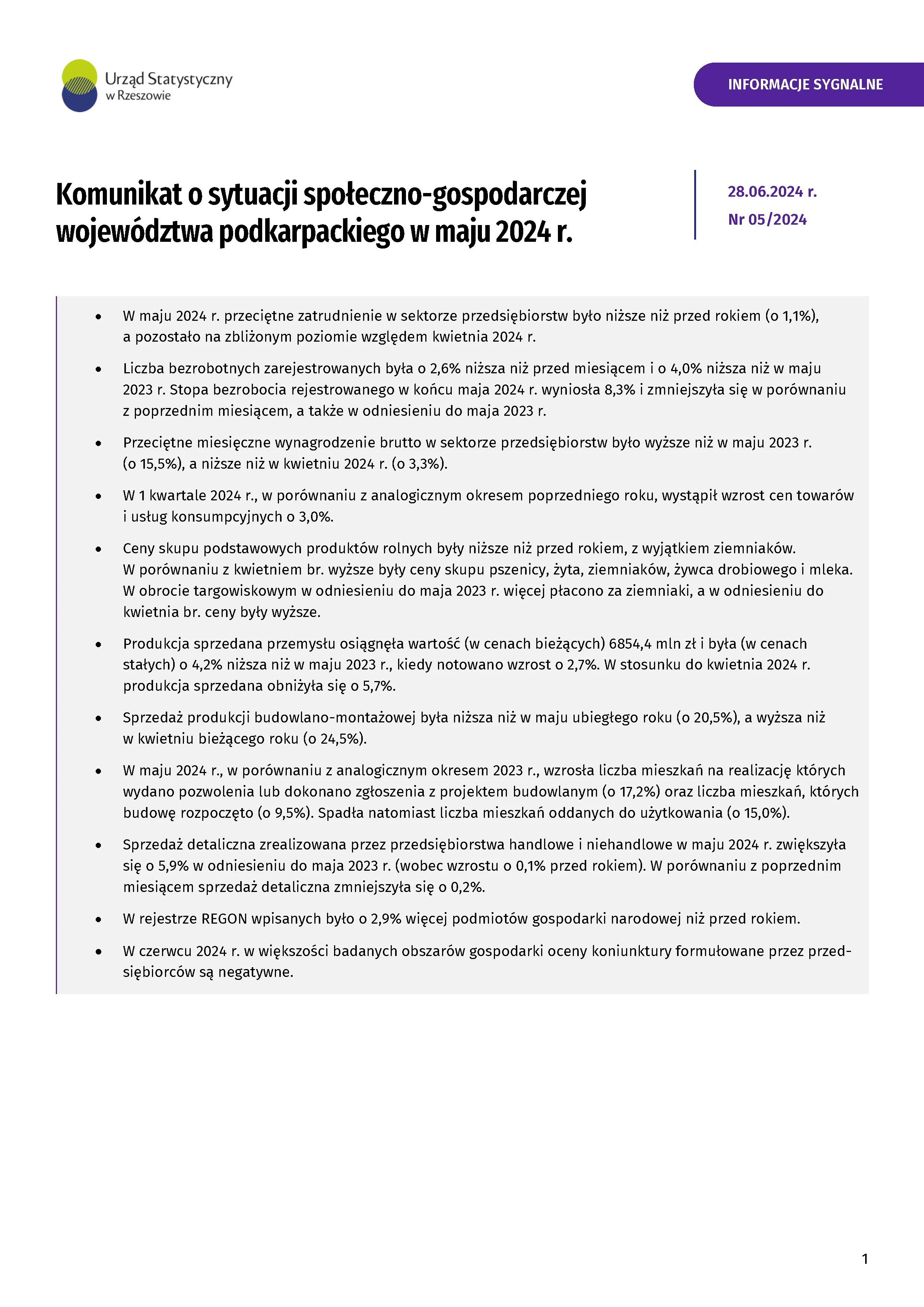 - Komunikat o sytuacji społeczno-gospodarczej województwa podkarpackiego w kwietniu 2024 r.