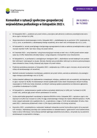 Komunikat o sytuacji społeczno-gospodarczej województwa podlaskiego w listopadzie 2022 r.
