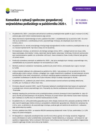 Komunikat o sytuacji społeczno-gospodarczej województwa podlaskiego w październiku 2020 r.