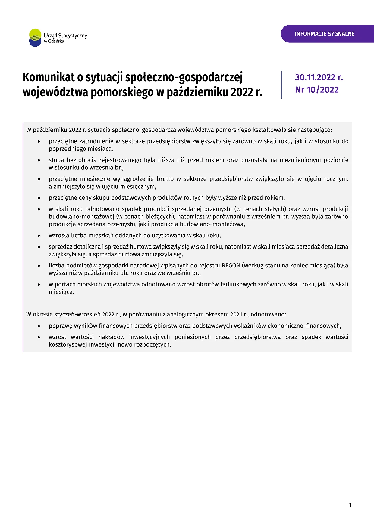- Komunikat o sytuacji społeczno-gospodarczej województwa pomorskiego we wrześniu 2022 r.
