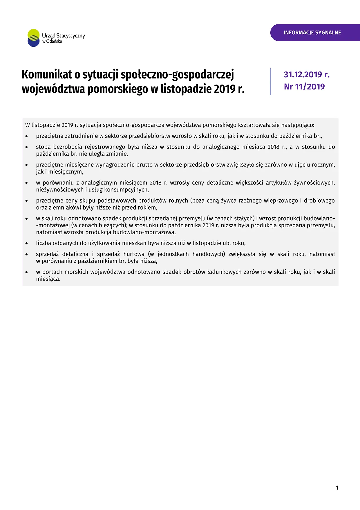 - Komunikat o sytuacji społeczno-gospodarczej województwa pomorskiego w grudniu 2019 r.