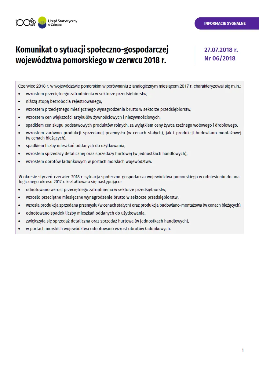 - Komunikat o sytuacji społeczno-gospodarczej województwa pomorskiego w lipcu 2018 r.