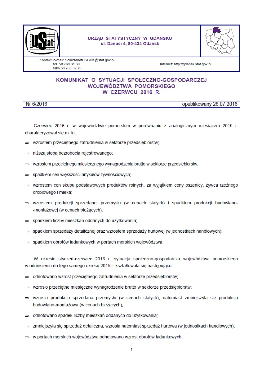 - Komunikat o sytuacji społeczno-gospodarczej województwa pomorskiego w lipcu 2016 r.