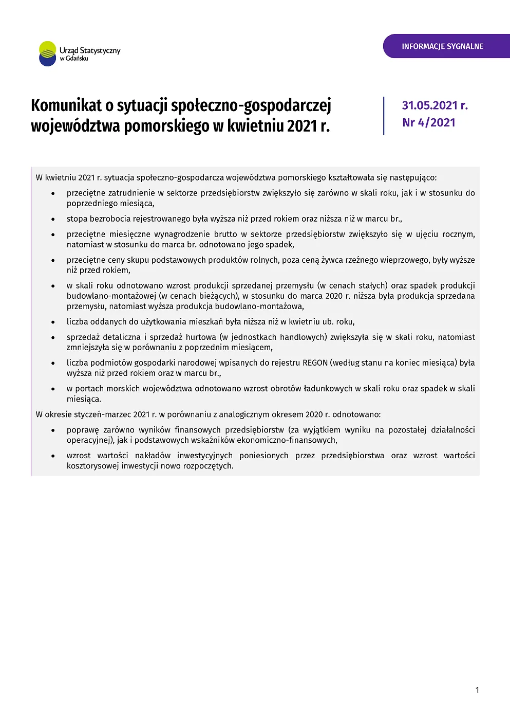 - Komunikat o sytuacji społeczno-gospodarczej województwa pomorskiego w marcu 2021 r.