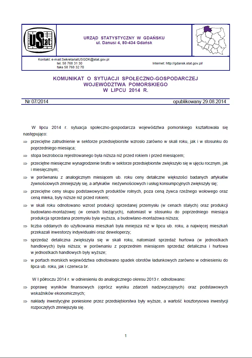 - Komunikat o sytuacji społeczno-gospodarczej województwa pomorskiego w sierpniu 2014 r.