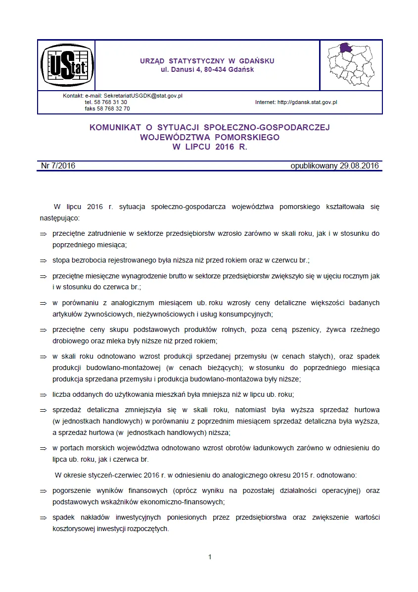 - Komunikat o sytuacji społeczno-gospodarczej województwa pomorskiego w sierpniu 2016 r.