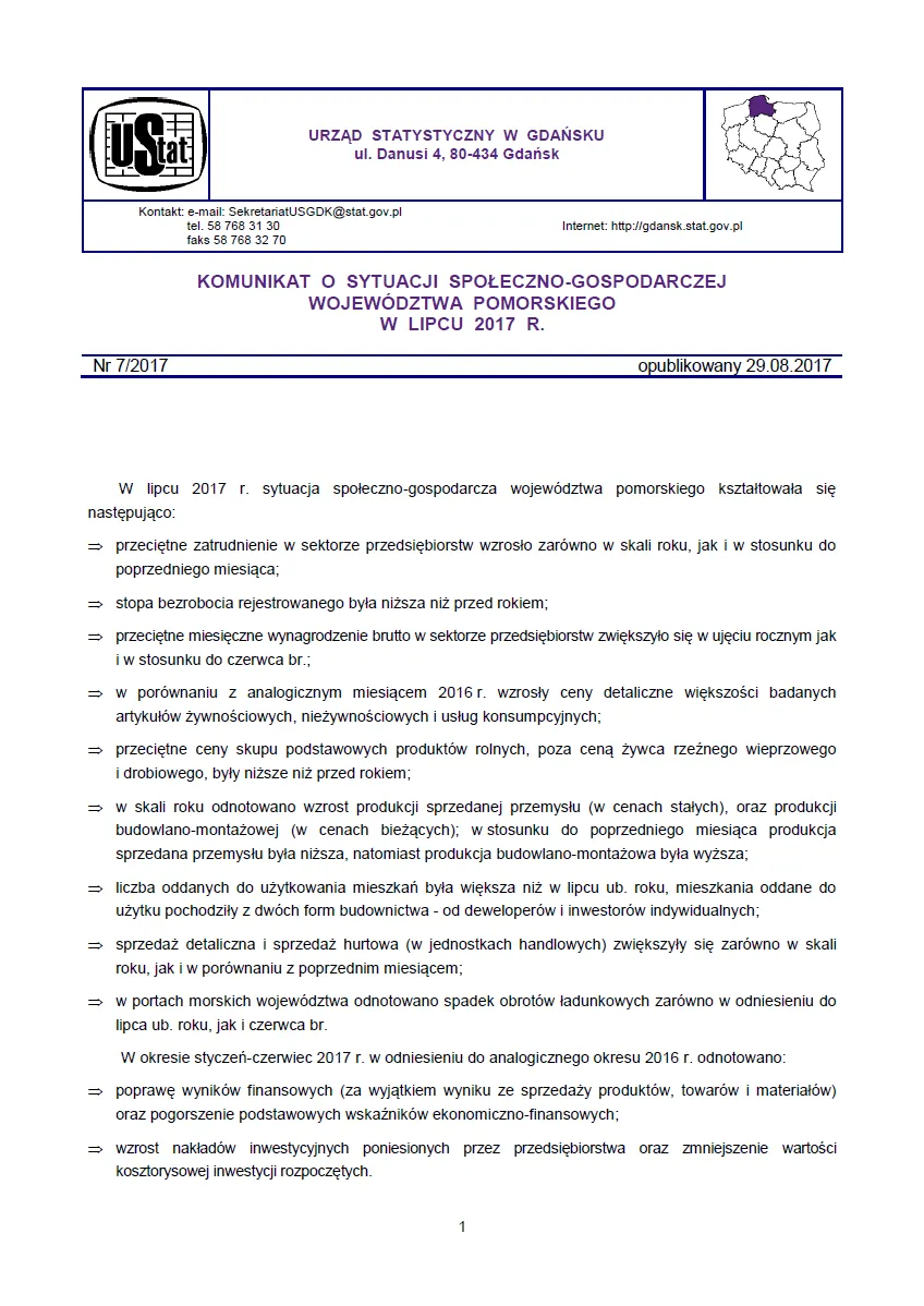 - Komunikat o sytuacji społeczno-gospodarczej województwa pomorskiego w sierpniu 2017 r.