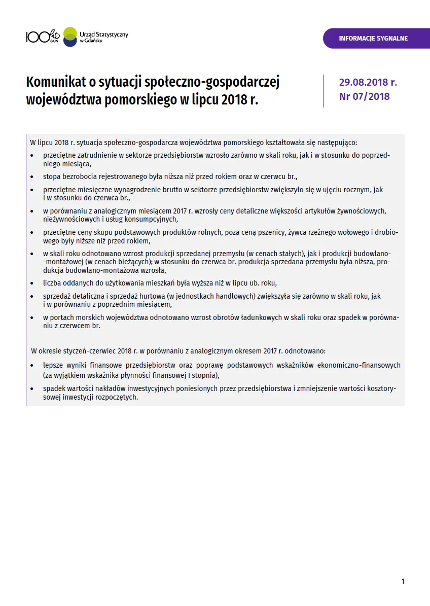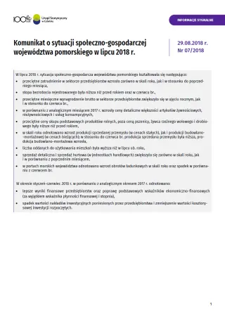 - Komunikat o sytuacji społeczno-gospodarczej województwa pomorskiego w sierpniu 2018 r.