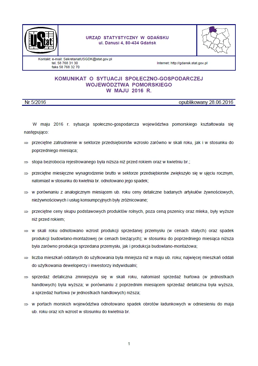 Komunikat o sytuacji społeczno-gospodarczej województwa pomorskiego w maju 2016 r.