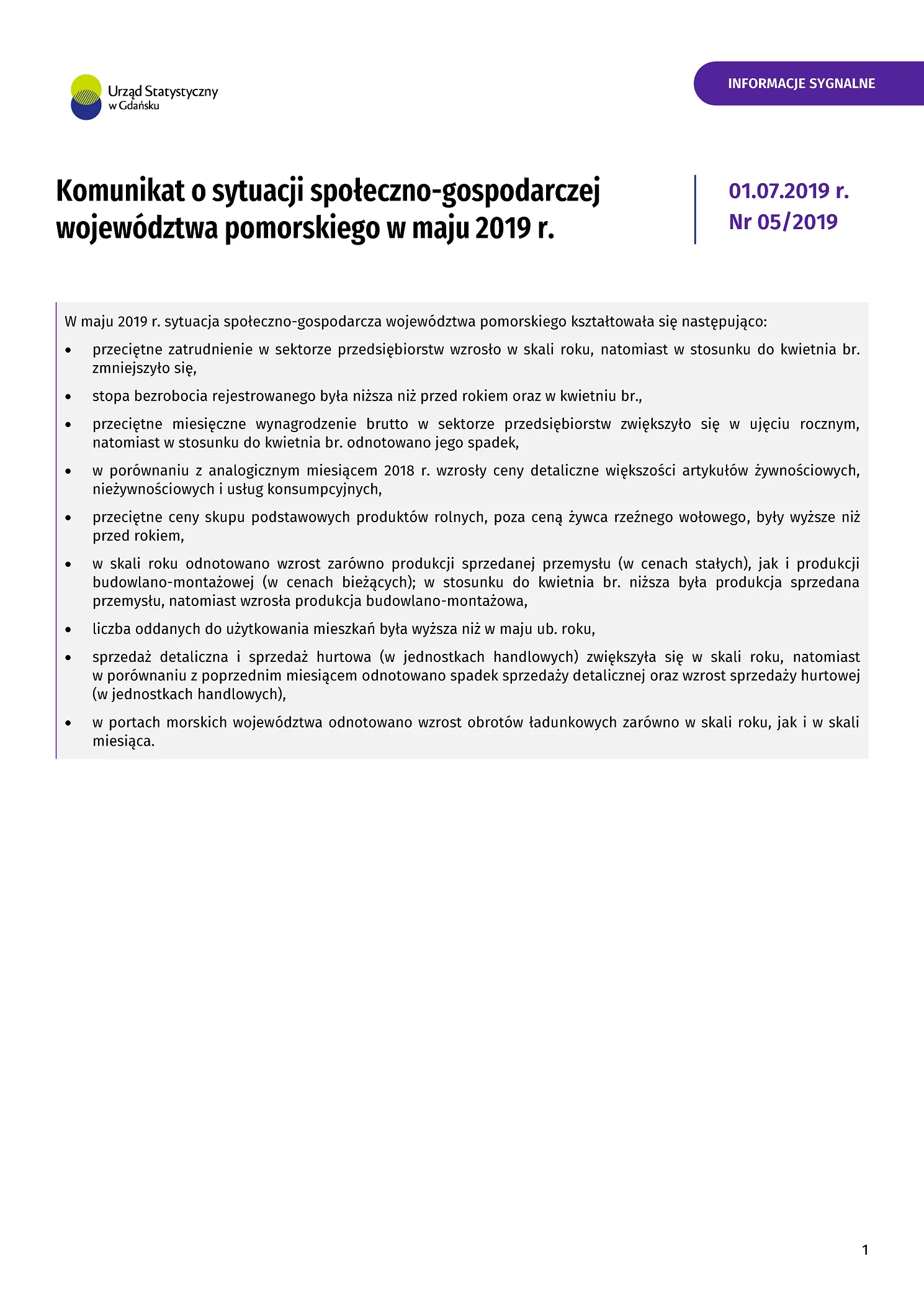 - Komunikat o sytuacji społeczno-gospodarczej województwa pomorskiego w lipcu 2019 r.