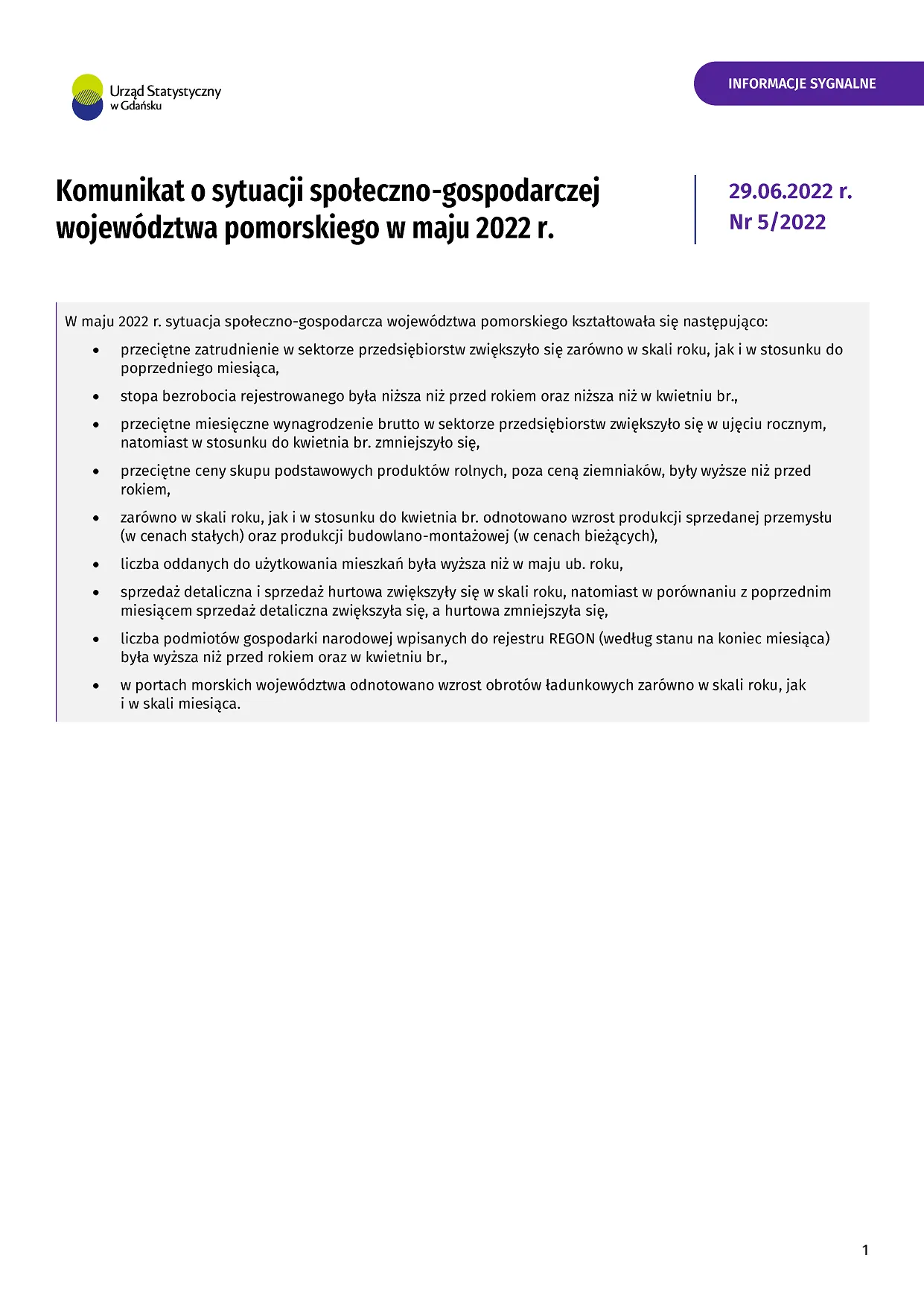- Komunikat o sytuacji społeczno-gospodarczej województwa pomorskiego w czerwcu 2022 r.