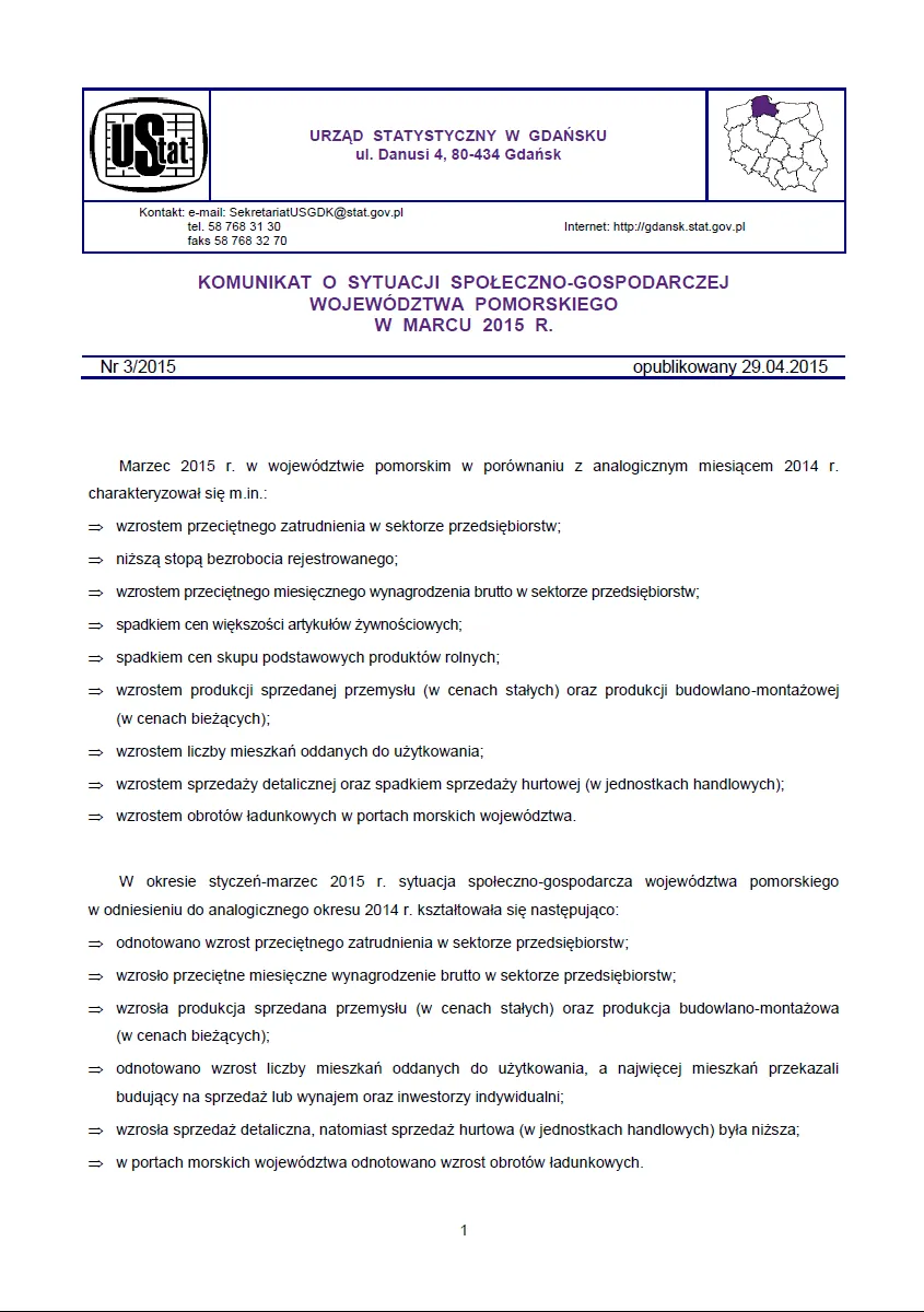 - Komunikat o sytuacji społeczno-gospodarczej województwa pomorskiego w kwietniu 2015 r.