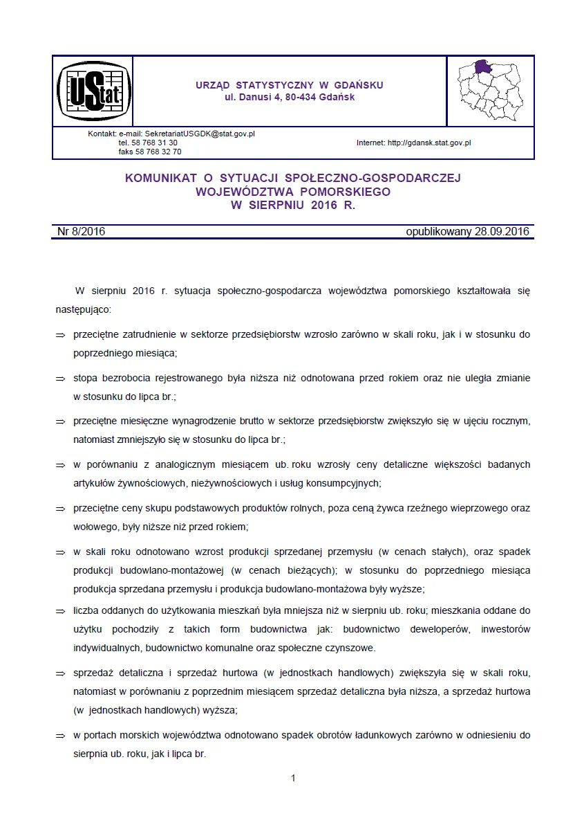 Komunikat o sytuacji społeczno-gospodarczej województwa pomorskiego w sierpniu 2016 r.