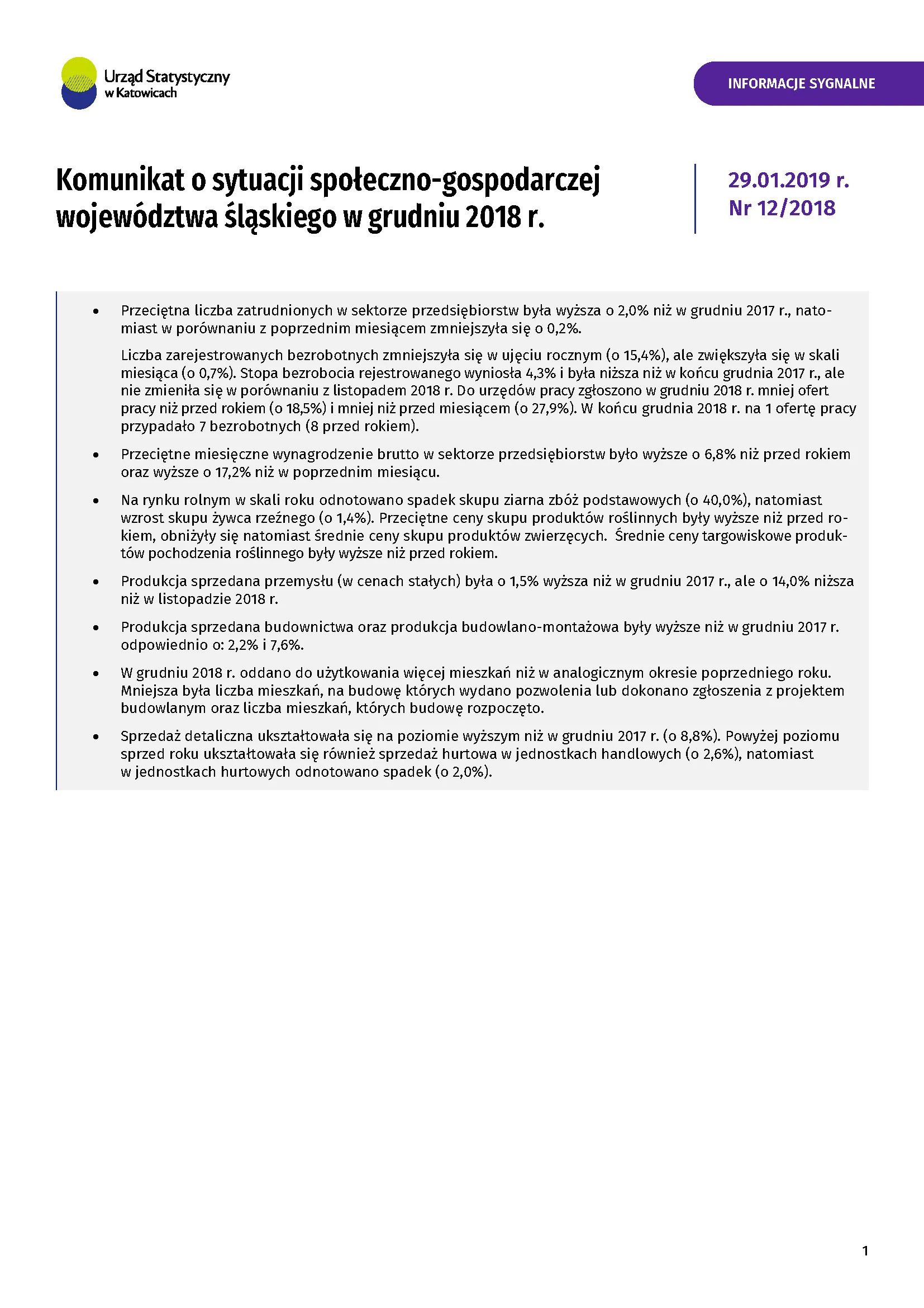 Komunikat o sytuacji społeczno-gospodarczej województwa śląskiego w grudniu 2018 r.