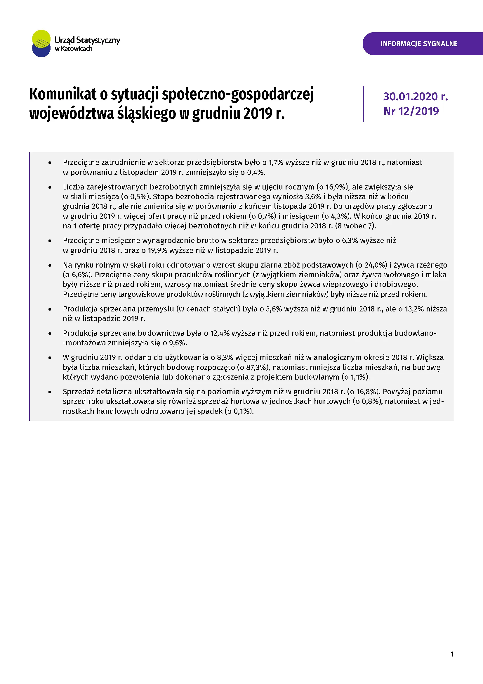 Komunikat o sytuacji społeczno-gospodarczej województwa śląskiego w grudniu 2019 r.