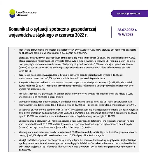 - Komunikat o sytuacji społeczno-gospodarczej województwa śląskiego w czerwcu 2022 r.