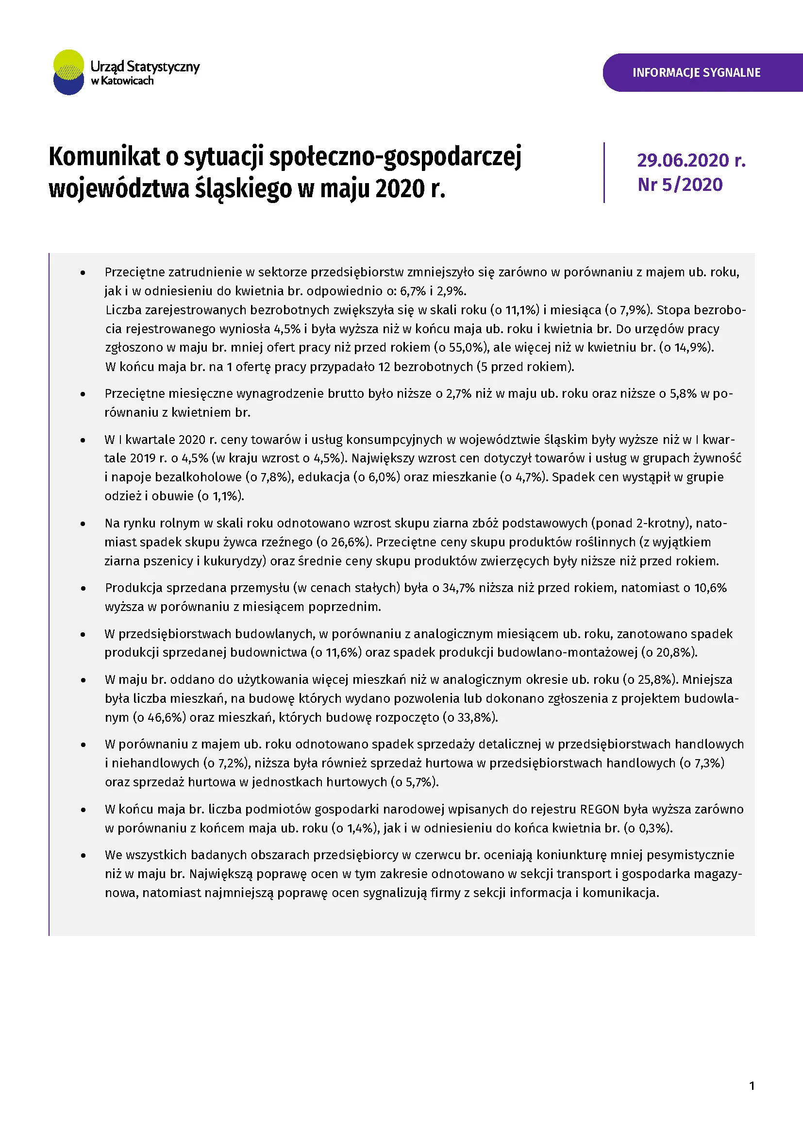 - Komunikat o sytuacji społeczno-gospodarczej województwa śląskiego w czerwcu 2020 r.