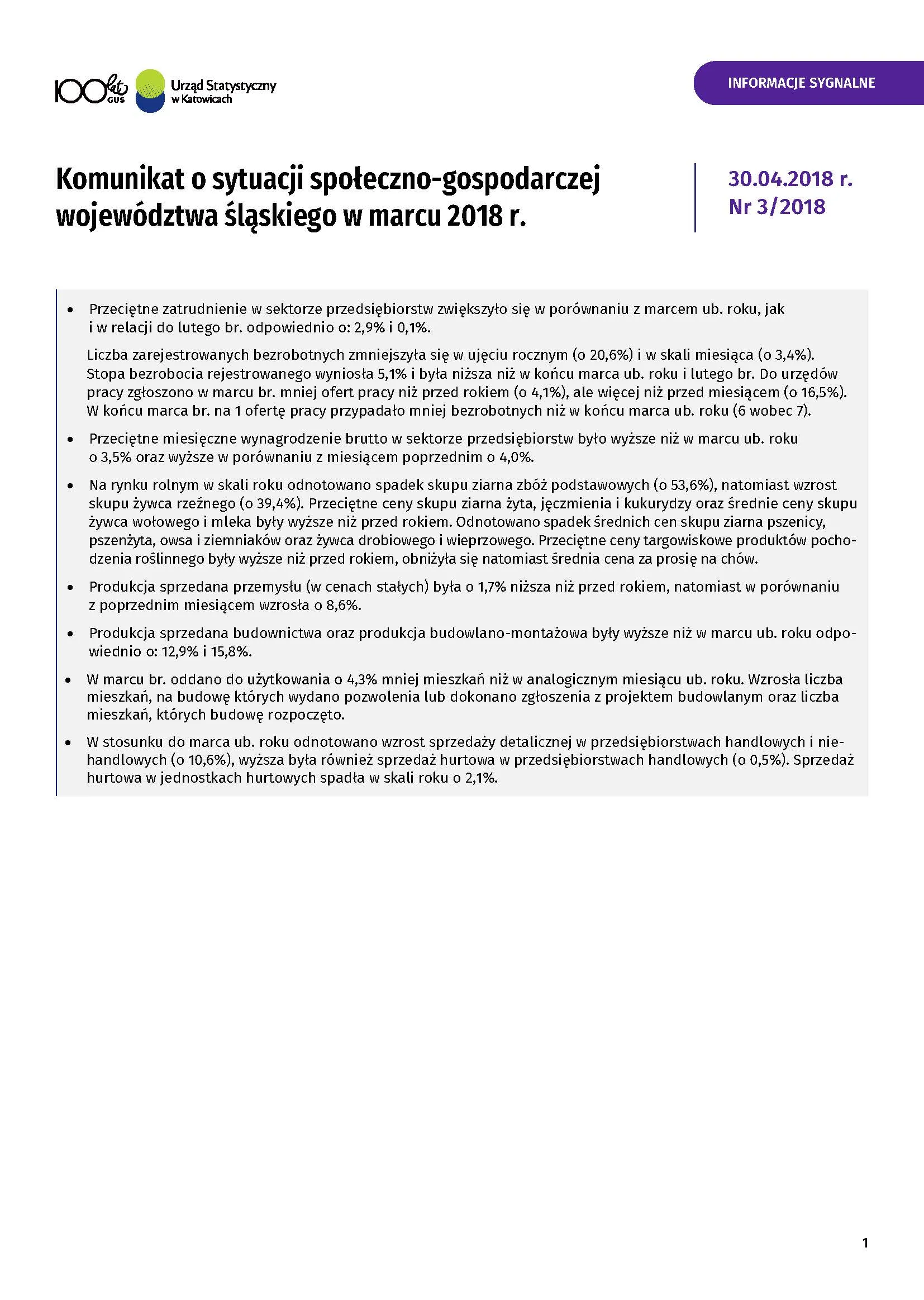 - Komunikat o sytuacji społeczno-gospodarczej województwa śląskiego w kwietniu 2018 r.