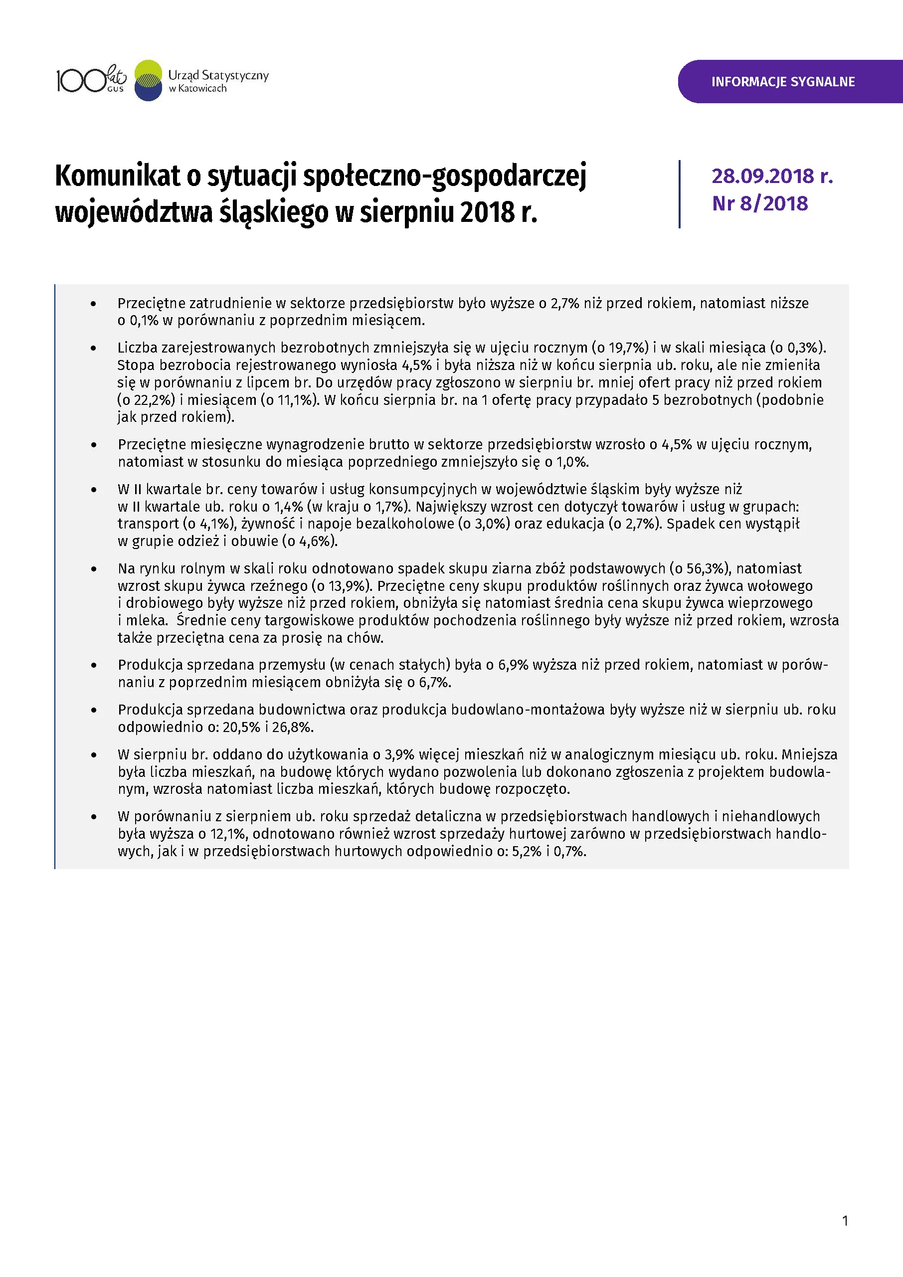 - Komunikat o sytuacji społeczno-gospodarczej województwa śląskiego we wrześniu 2018 r.