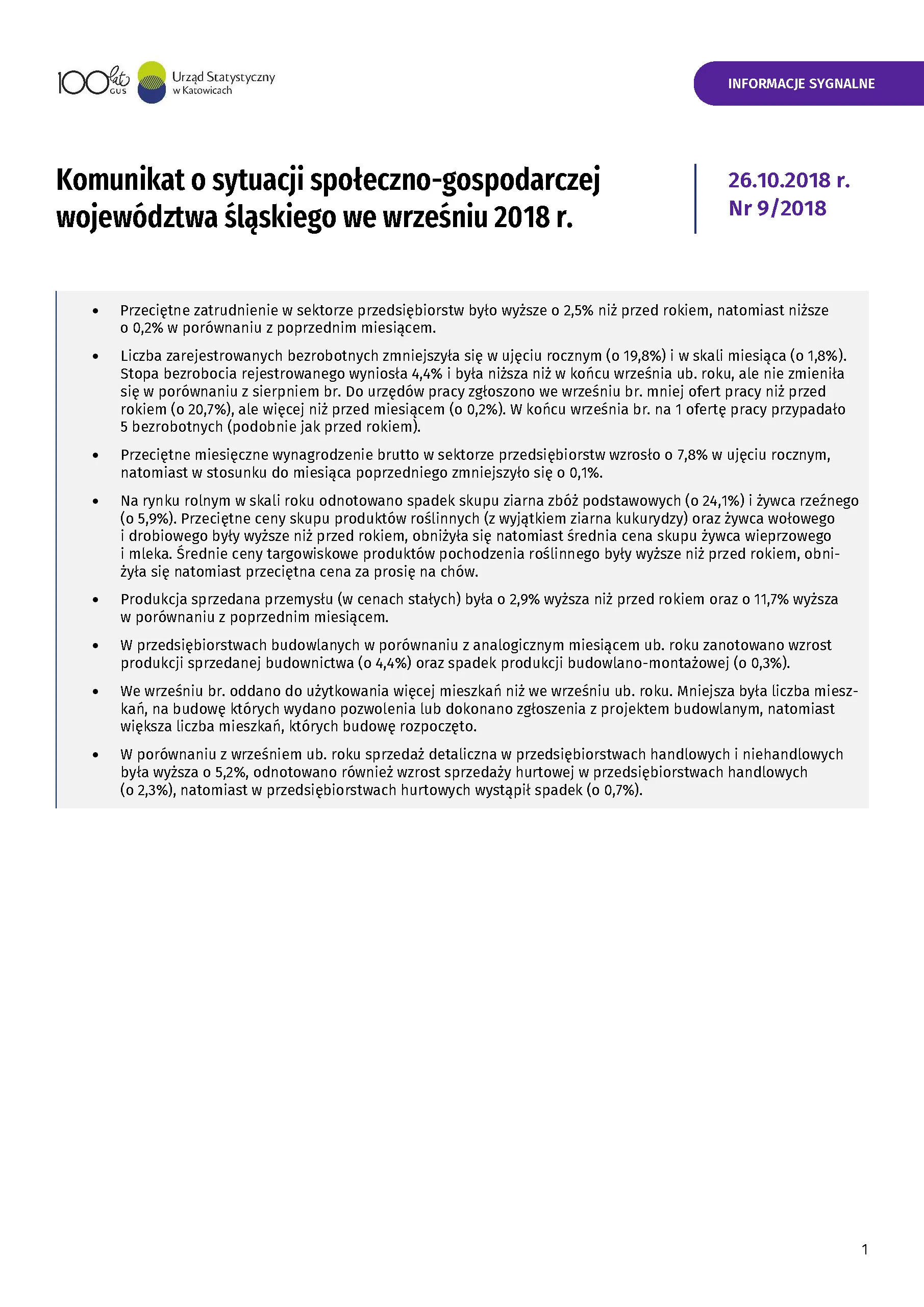 - Komunikat o sytuacji społeczno-gospodarczej województwa śląskiego w październiku 2018 r.