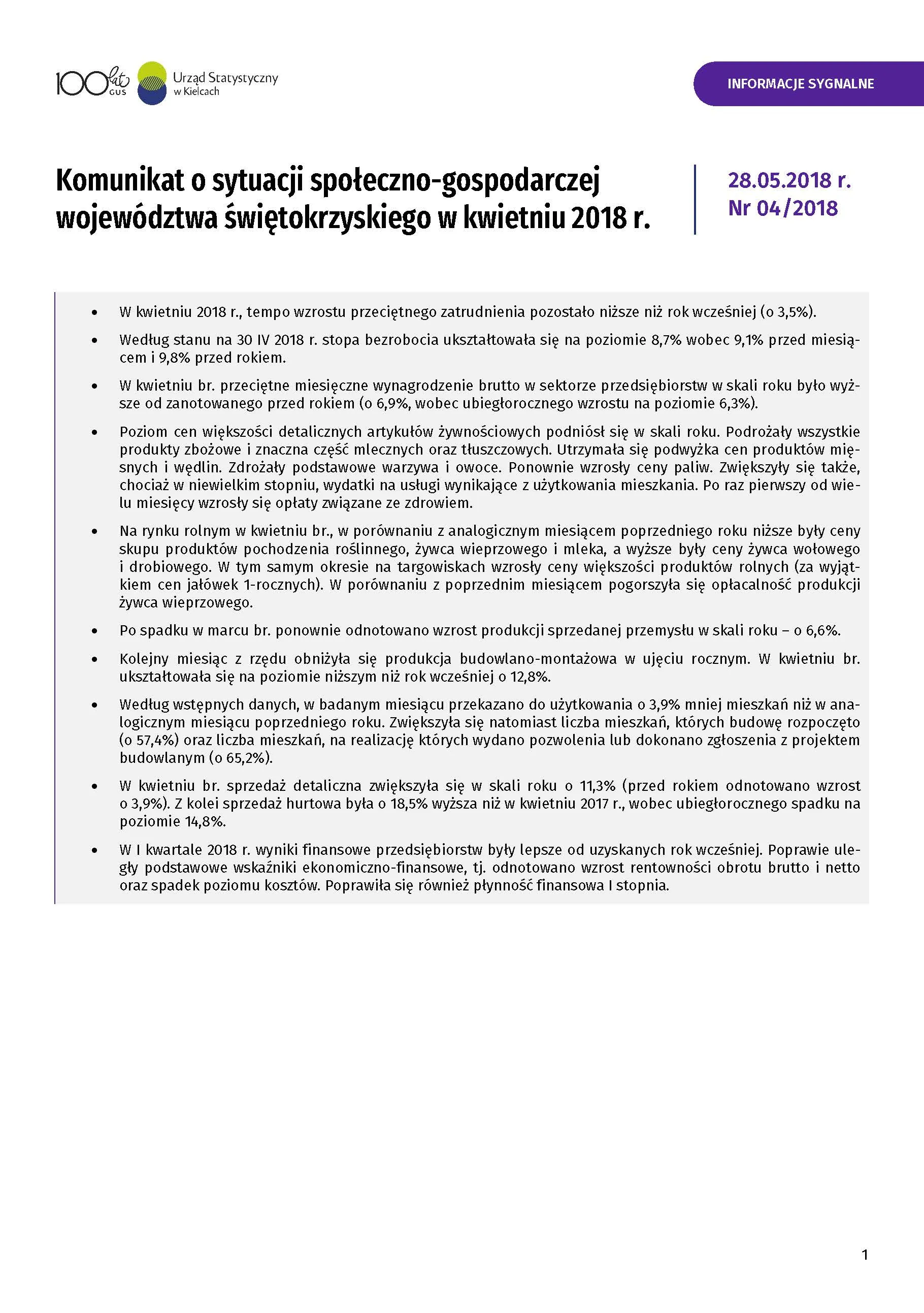 - Komunikat o sytuacji społeczno-gospodarczej województwa świętokrzyskiego - maj 2018