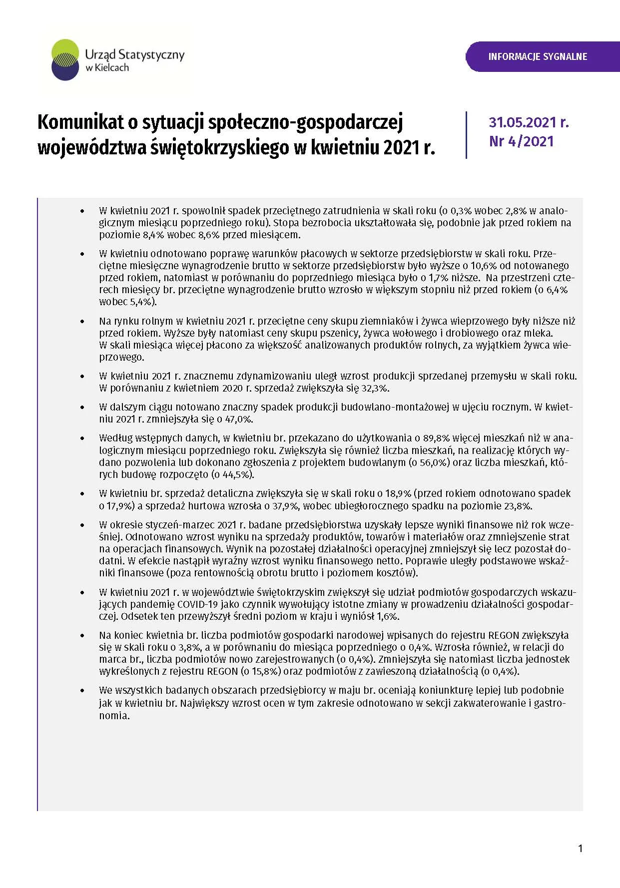 Komunikat o sytuacji społeczno-gospodarczej województwa świętokrzyskiego - kwiecień 2021