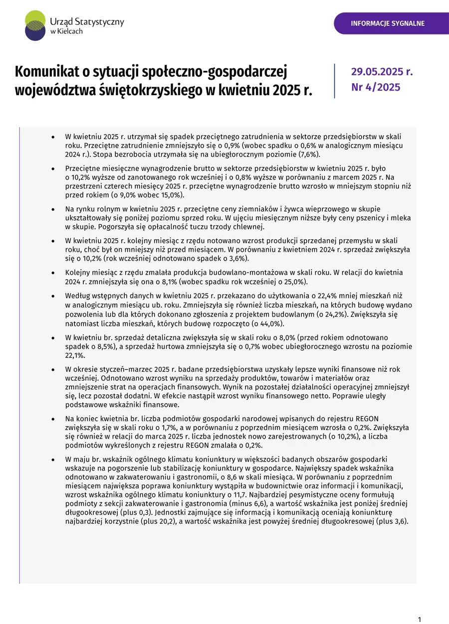 - Komunikat o sytuacji społeczno-gospodarczej województwa świętokrzyskiego - maj 2025