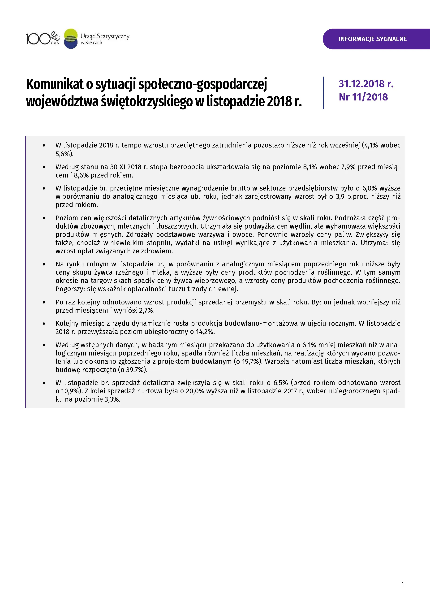 - Komunikat o sytuacji społeczno-gospodarczej województwa świętokrzyskiego - grudzień 2018