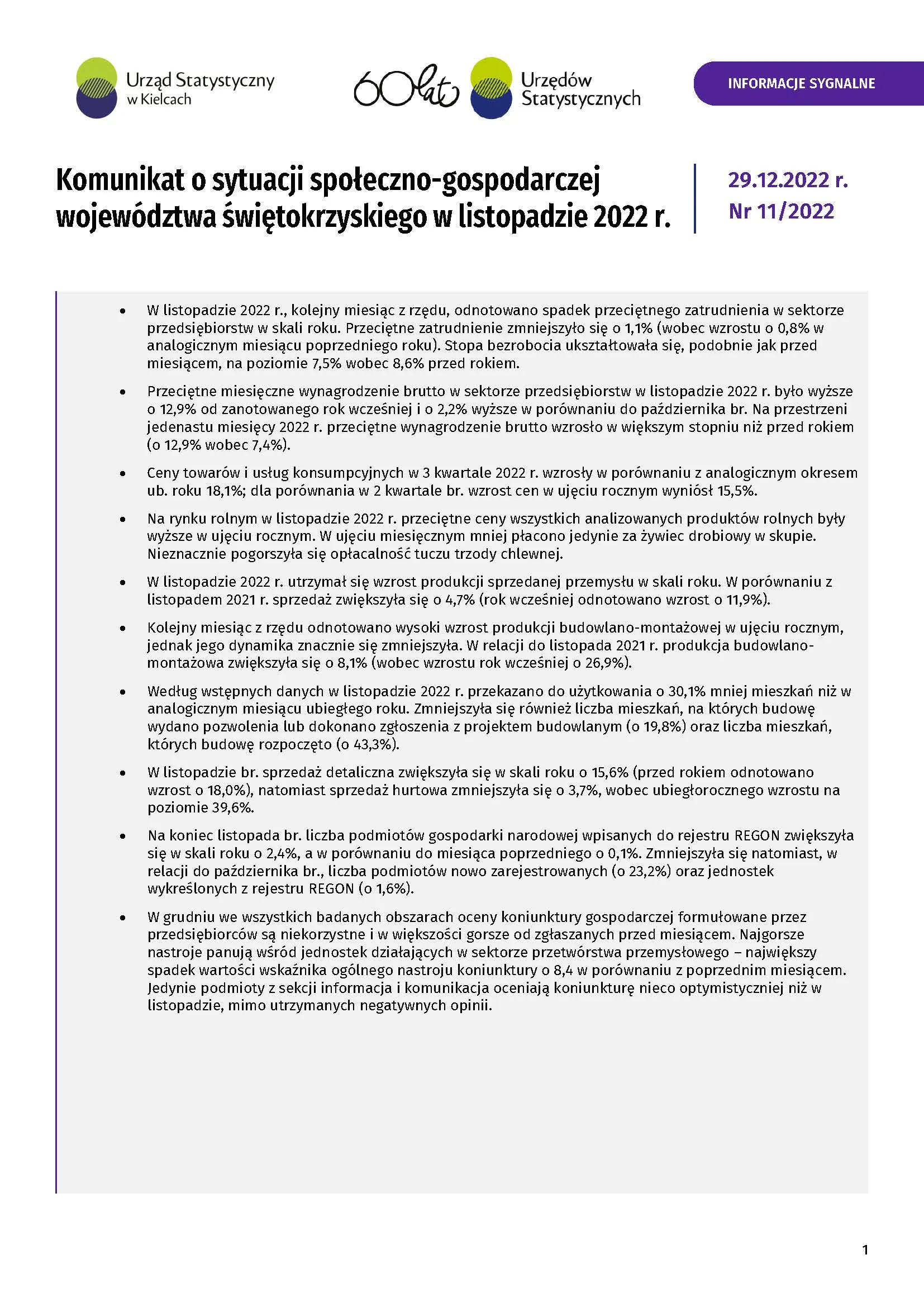 Komunikat o sytuacji społeczno-gospodarczej województwa świętokrzyskiego - listopad 2022