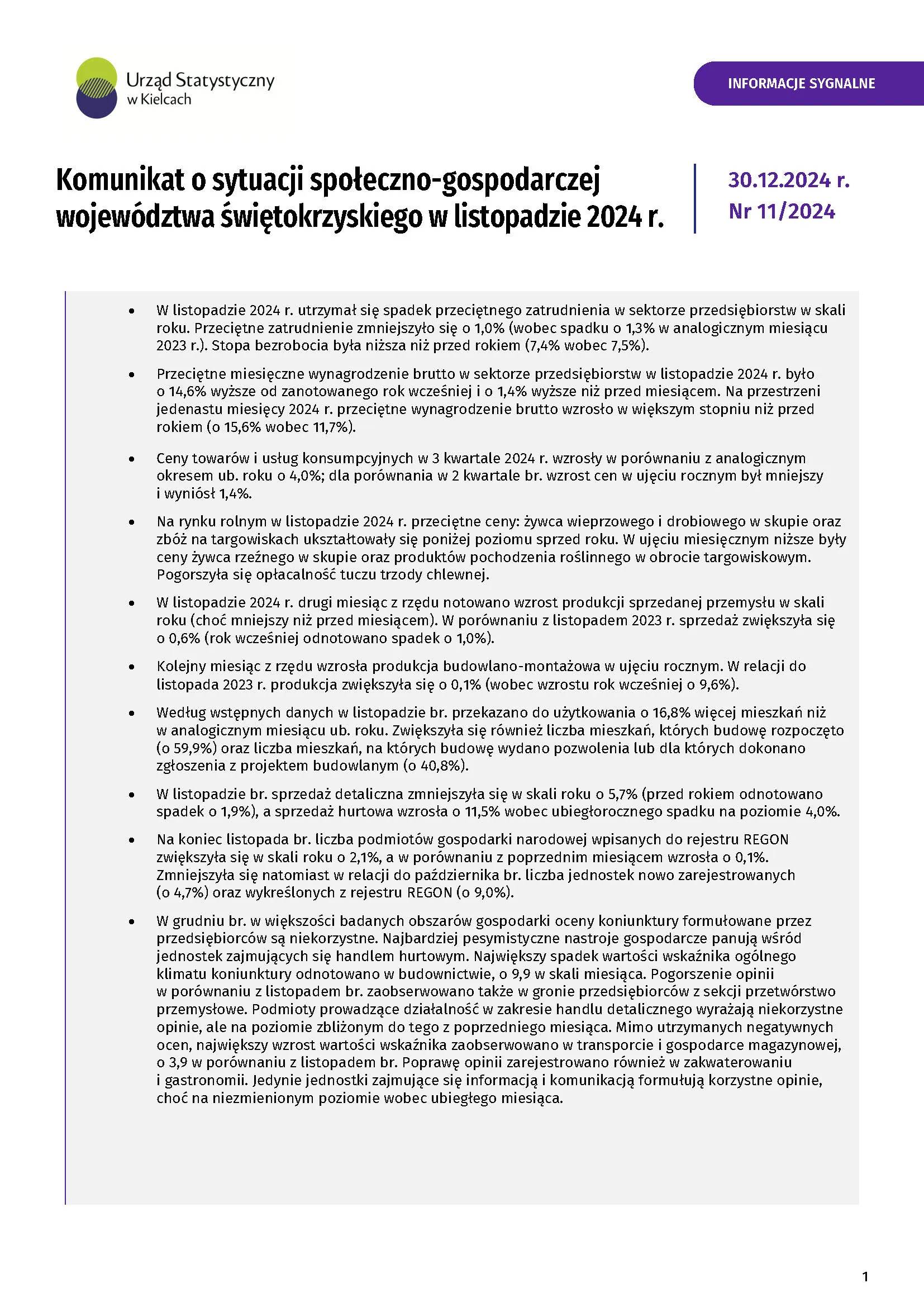 Komunikat o sytuacji społeczno-gospodarczej województwa świętokrzyskiego - listopad 2024