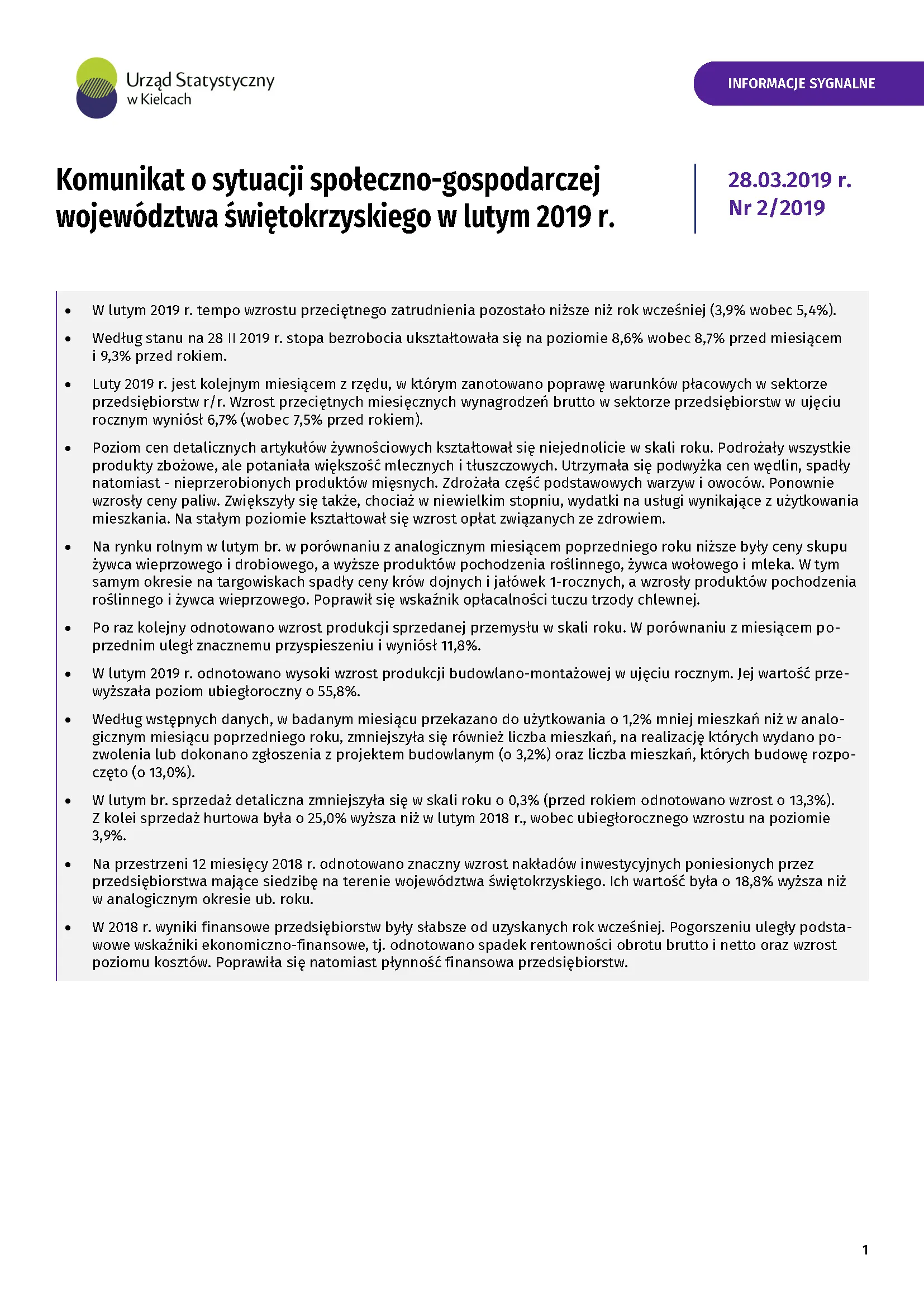 - Komunikat o sytuacji społeczno-gospodarczej województwa świętokrzyskiego - marzec 2019