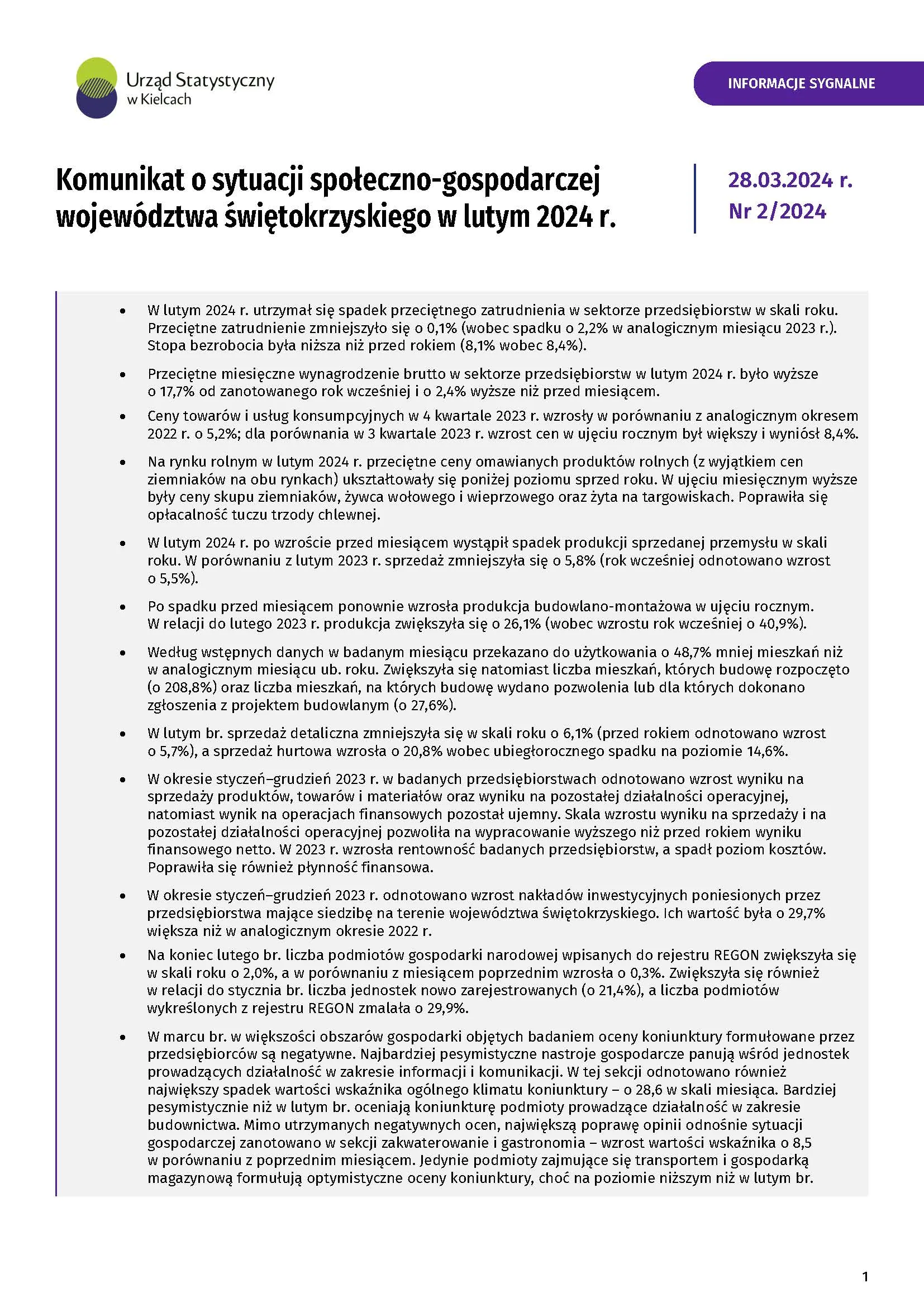 - Komunikat o sytuacji społeczno-gospodarczej województwa świętokrzyskiego - marzec 2024
