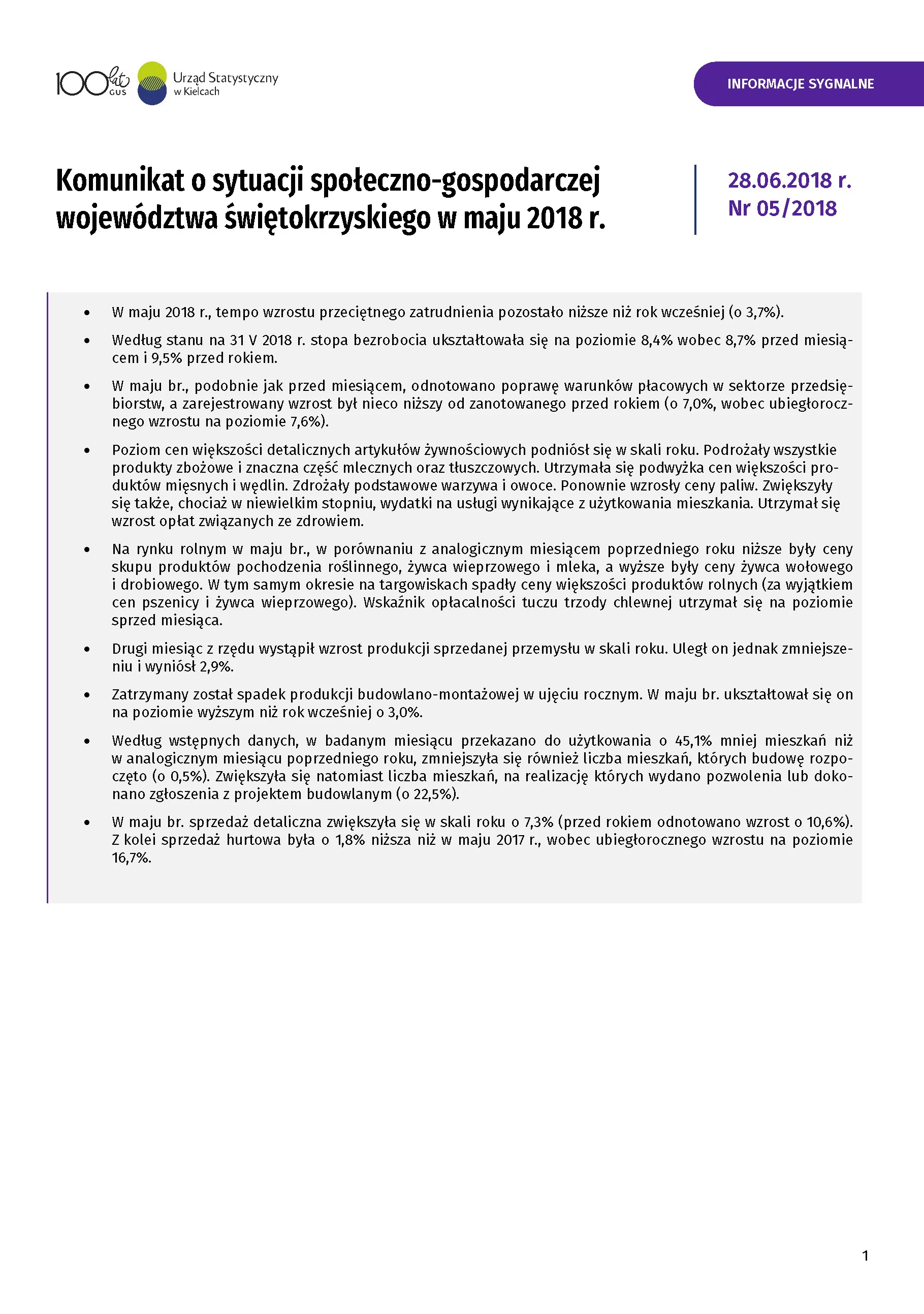 - Komunikat o sytuacji społeczno-gospodarczej województwa świętokrzyskiego - czerwiec 2018