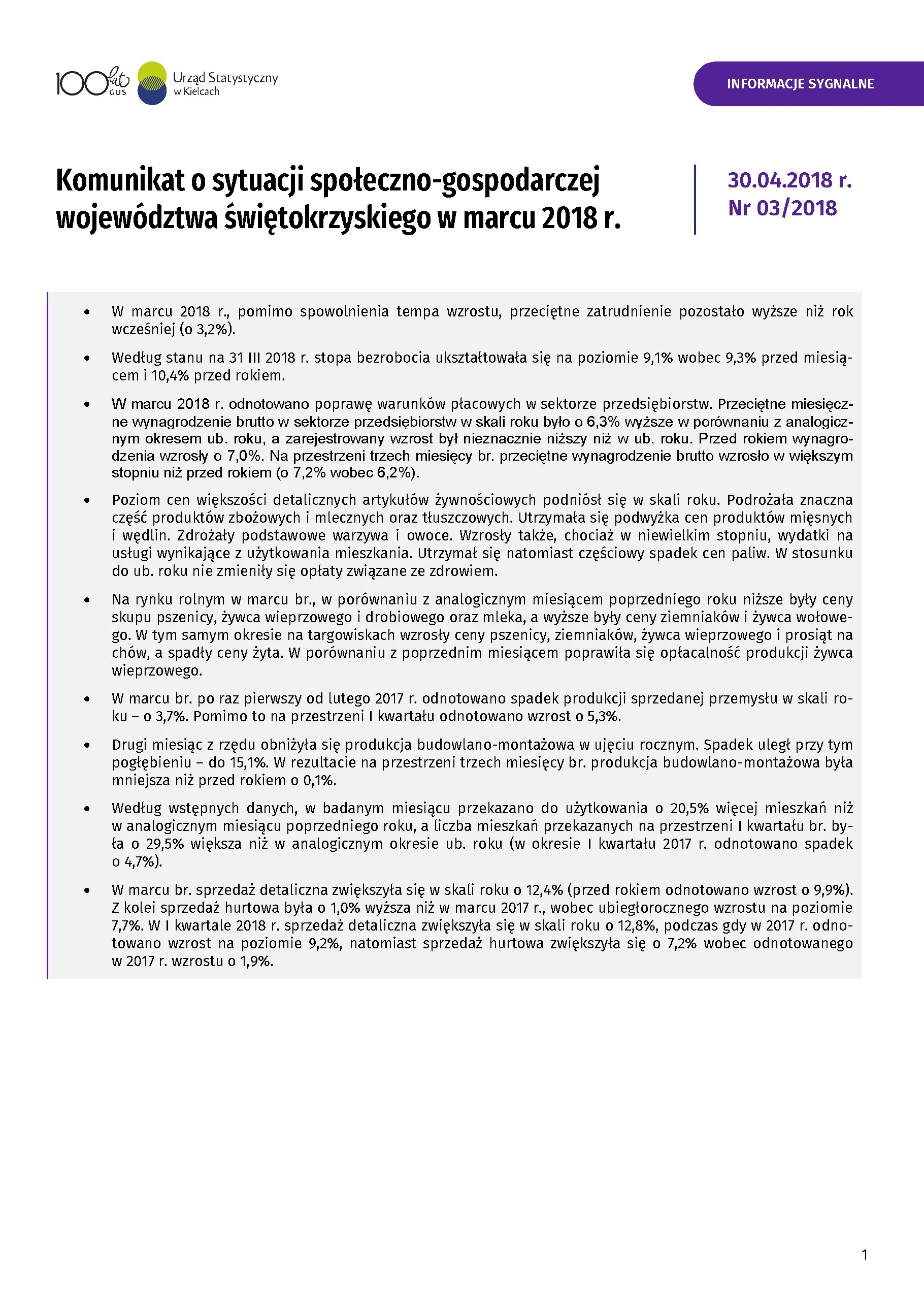 - Komunikat o sytuacji społeczno-gospodarczej województwa świętokrzyskiego - kwiecień 2018