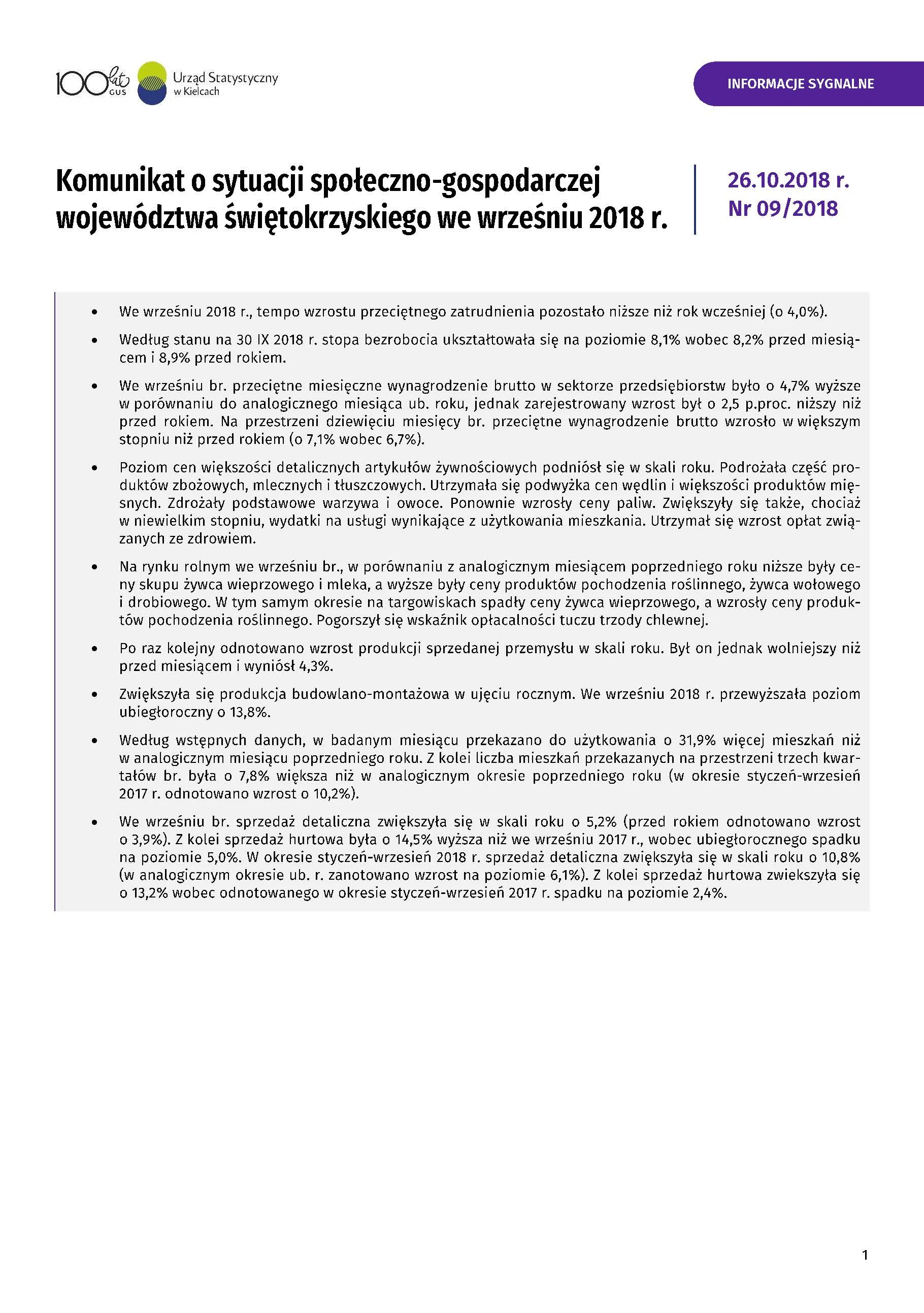 - Komunikat o sytuacji społeczno-gospodarczej województwa świętokrzyskiego - październik 2018