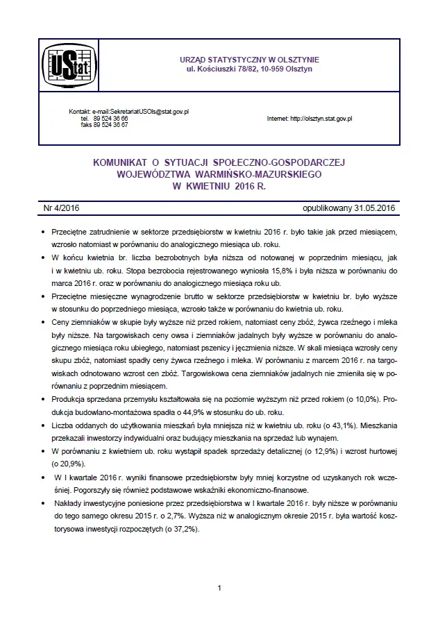 - Komunikat o sytuacji społeczno-gospodarczej województwa warmińsko-mazurskiego w marcu 2016 r.