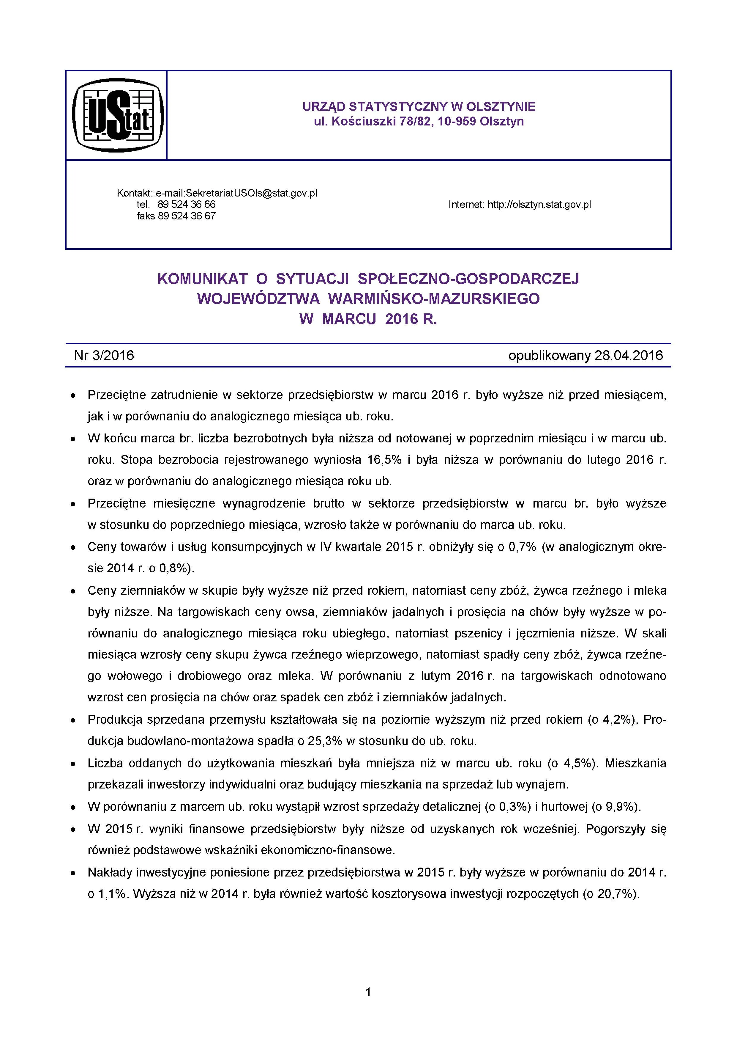 - Komunikat o sytuacji społeczno-gospodarczej województwa warmińsko-mazurskiego w kwietniu 2016 r.